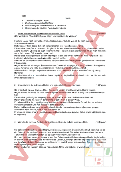 Test Name: Zeichensetzung dir. Rede Zeichensetzung indirekte Rede Umformung der indirekten Rede in die direkte Umformung der direkten Rede in die indirekte 1. Setze alle fehlenden Satzzeichen der direkten Rede. (Der verbotene Wald, S.270 ff. aus: „Harry und der Stein der Weisen (7 Punkte) Folgt mir sagte Filch ich wette, ihr überlegt euch das nächste Mal, ob ihr noch mal eine Schulvorschrift brecht. Bist du das, Filch? Beeile dich, ich will aufbrechen rief Hagrid aus der Ferne. Filch meinte daraufhin schadenfroh Ihr glaubt, ihr werdet euch mit diesem Hornochsen einen netten Abend machen? Überlegt es euch lieber noch mal – es geht in den Wald und es würde mich wundern, wenn ihr in einem Stück wieder rauskommt. Malfoy blieb wie angewurzelt stehen und fragte In den Wald? Wir können da nicht reingehen – da treibt sich allerlei herum – auch Werwölfe, hab ich gehört. Ihr hättet an die Werwölfe denken sollen, bevor ihr euch in Schwierigkeiten gebracht habt antwortete Filch gemein. Hagrid kam ihnen mit langen Schritten aus der Dunkelheit entgegen, mit Fang bei Fuss. Er trug seine grosse Armbrust und hatte einen Köcher mit Pfeilen über die Schultern gehängt. Wird allmählich Zeit gab Hagrid von sich warte schon ne halbe Stunde. Alles in Ordnung, Harry, Hermine? Ich wäre lieber nicht so freundlich zu ihnen, Hagrid schimpfte Filch schliesslich sind sie hier, um sich ihre Strafe abzuholen. 2. Unterstreiche die indirekten Reden und setze die fehlenden Kommas. (10 Punkte) Ob er deshalb zu spät dran sei. Ob er ihnen eine Lektion erteilt habe wollte Hagrid wissen. Hagrid warnte Filch dies sei nicht seine Aufgabe. Er habe seine Arbeit erledigt und er übernehme ab hier. Filch meinte gehässig bei Morgengrauen sei er zurück und hole die Reste von ihnen ab. Malfoy protestierte mit Panik in der Stimme er gehe nicht in diesen Wald. Er müsse erklärte ihm Hagrid grimmig wenn er in Hogwarts bleiben wolle. Er hielt ihm vor er habe etwas ausgefressen und nun müsse er dafür bezahlen. Malfoy beklagte sich er habe gedacht, sie würden die Hausordnung abschreiben oder so was. Wenn sein Vater wüsste, was er hier tue, würde er Er würde dir sagen knurrte Hagrid dass es in Hogwarts eben so zugehe. Er tue etwas Nützliches, oder er fliege raus. 3. Wandle die indirekte Rede in die direkte um. Schreibe auf ein separates Blatt. (10 Punkte) Sie sollten mal hersehen, sagte Hagrid, ob sie das Zeug sähen. Das sei Einhornblut. Irgendwo sei da ein Einhorn, das von irgendetwas schwer verletzt worden sei. Sie sollten jetzt versuchen, das arme Tier zu finden. Vielleicht müssten sie es auch von seinem Leiden erlösen. Und was passiere, wenn das andere – was das Einhorn verletzt habe – sie zuerst finde, fragte Malfoy. In diesem Wald sei nichts, was ihnen etwas zu Leide tue, solange er und Fang dabei seien. Sie sollten auf dem Weg bleiben. Also dann, sie sollten sich in zwei Gruppen teilen und der Spur in verschiedene Richtungen folgen, befahl Hagrid. Malfoy warf einen raschen Blick auf Fangs lange Zähne und bettelte, er wolle Fang. 4. Wenn ich zaubern könnte (7 Punkte) Schreibe 7 Sätze, indem du 7 verschiedene Verben im Konjunktiv II benutzt. 5. a) In welchem Modus steht bei folgenden Sätzen das Verb? Der Torschütze, er lebe hoch! Möge dieser Augenblick in unser aller Erinnerung bleiben! (4 Punkte) Was wird in diesen Sätzen ausgedrückt? b) Setze folgende Indikativform in den Konjunktiv I: man nimmt Wo findet man diese Form? 6. Wandle die direkte Rede in die indirekte um. Schreibe auf ein separates Blatt. (12 Punkte) „Könnte ein Werwolf die Einhörner töten?, fragte Harry. „Nicht schnell genug, flüsterte Hagrid, „es ist nicht leicht, ein Einhorn zu fangen, sie sind mächtige Zaubergeschöpfe. Ich habe noch nie gehört, dass eines verletzt wurde. Plötzlich rief Hagrid: „Wer versteckt sich da? Zeig dich, ich bin bewaffnet! Und es erschien – war es ein Mann oder ein Pferd? Bis zur Hüfte ein Mann mit rotem Haar und Bart, doch darunter hatte er den Körper eines Pferdes. Harry und Hermine hielten den Atem an. „Einen guten Abend, Hagrid, grüsste Ronan. „Willst du gerade auf mich schiessen? Hagrid entschuldigte sich: „Man kann nie vorsichtig genug sein. Was Böses streift in diesem Wald herum. Das sind übrigens Harry Potter und Hermine Granger, Schüler vom Schloss oben.