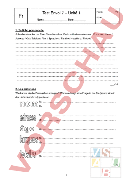 Fr Test Envol 7 – Unité 1 Points /70 note: Nom : Date 1. Ta fiche personnelle Schreibe einen kurzen Texu über die selber. Darin enthalten sein muss Vorname Name Adresse Ort Telefon Alter Sprachen Familie Haustiere Freizeit. . . . /10 2. Les questions Wie kannst du die Personalien erfragen Wenn verlangt, eine Frage in der Du-(a) und eine in der Höflichkeitsform(b) notieren. 1a. . 1b. . 2a. . 2b. . 3a. . 4a. . 4b. . 5a. . 5b. ./9 1 3. les possessifs. Trage die entsprechenden Formen in die folgende Tabelle ein. le père je la mère les parents mon père tu ta mère il/elle nous nos parents vous ils/elles/7.5 4. Nimm die Rolle von Eric ein und ergänze mit mon, ma, mes, notre, votre. Oui, je te présente . famille. Ça cest moi Voilà parents:.père sappelle Marc et mère sappelle Louise. Ici, tu vois soeur Anne. – Et vous avez un chien – oui, chien, cest Hector. – Et ça, cest . Chat? – Oh non, nous navons pas de chat. Cest le chat de . Ami La mère « Julien, chaussures sont sales » Julien « Je vais cirer chaussures immédiatement, maman »/4 5. Grammaire singulier et pluriel Mets les phrases au pluriel ou au singulier (setze die Sätze in die Mehrzahl oder in die Einzahl). a. Jhabite à Zürich. b. Est-ce que vous mangez vos sandwiches? /4 2 6. les verbes en –er – les verbes auxilliaires (avoir et être – faire au présent. Konjugiere folgende Verben im Präsens. a) J (habiter) en Suisse. Je (être) Suisse. b) Nous (manger) une pomme. c) Elle (téléphoner) à Pierre. d) Est.ce que vous (faire) une promenade. e) Ils (avoir) des vacances. f) Eric (parler) avec Anne. g) Nous (marcher) à Lausanne. h) Vous (danser) toute la nuit. i) Quoi? Vous (être) Madame Dorin? j) Elles (expliquererklären) la phrase. k) Est-ce que tu (être) daccord avec moi? l) Marie et Dominique (parler) dans la rue. m) Tim et moi, nous (aimer) la glace. n) Christophe (nagerschwimmen) dans locéan./15 7. Setze die Verben „avoir, „être, und „habiter sinnvoll inden Text ein.6 Je mappelle Jean. J14 ans. J un frère et une soeur. Mon frère mécanicien. Il 23 ans. Ma soeur secrétaire dans un bureau. Elle 19 ans. J. chez mes parents. Nous une petite maison. Nous un joli jardin devant notre maison. Mon frère et ma soeur plus à la maison. Mon frère un appartement de 3 pièces. Il avec sa copine dans cet appartement. Elle très jolie, la copine de mon frère. Leur appartement formidable. Ils . en ville. Ils pas de jardin, mais ils une grand balcon./8.5 Bonne chance 3