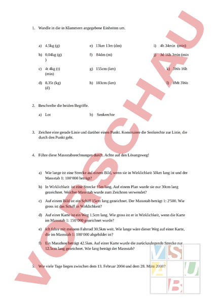 1. Wandle in die in Klammern angegebene Einheiten um. a) 4.5kg (g) e) 13km 13m (dm) i) 4h 34min (min) b) 0.04kg (g) f) 84dm (m) j) 3d 16h 3min (min c) 4t 4kg (t) (min) g) 155cm (km) k) 3Wo 16h d) 8.35t (kg) (d) h) 183cm (km) l) 8Mt 3Wo 2. Beschreibe die beiden Begriffe. a) Lot b) Senkrechte 3. Zeichne eine gerade Linie und darüber einen Punkt. Konstruiere die Senkrechte zur Linie, die durch den Punkt geht. 4. Führe diese Massstabsrechnungen durch. Achte auf den Lösungsweg! a) Wie lange ist eine Strecke auf einem Bild, wenn sie in Wirklichkeit 50km lang ist und der Massstab 1: 100‘000 beträgt? b) In Wirklichkeit ist eine Strecke 15m lang. Auf einem Plan wurde sie nur 30cm lang gezeichnet. Welcher Massstab wurde zum Zeichnen verwendet? c) Auf einem Bild ist ein Schiff 15cm lang gezeichnet. Der Massstab beträgt 1: 2500. Wie gross ist das Schiff in Wirklichkeit? d) Auf einer Karte ist ein Weg 1.5cm lang. Wie gross ist er in Wirklichkeit, wenn die Karte im Massstab 1: 150‘000 gezeichnet wurde? e) Ich fahre mit meinem Fahrrad 30.5km weit. Wie lange wäre dieser Weg auf einer Karte, die im Massstab 1: 100‘000 abgebildet ist? f) Ein Marathon beträgt 42.5km. Auf einer Karte wurde die zurückzulegende Strecke nur 12.5cm lang gezeichnet. Wie lang beträgt der Massstab? 5. Wie viele Tage liegen zwischen dem 13. Februar 2004 und dem 28. März 2008? 6. Runde folgende Zahlen auf die angegebene Stelle. Zehner Hunderter Tausender Zehntausende 34‘567 76‘543 87‘654 7. Herr Heuer fährt mit seinem Auto zum Arbeitsplatz. Ein Weg hin oder zurück beträgt 8.3km. Wie viele Kilometer wird Herr Heuer nach einer Woche zurückgelegt haben, wenn er zu Hause isst.