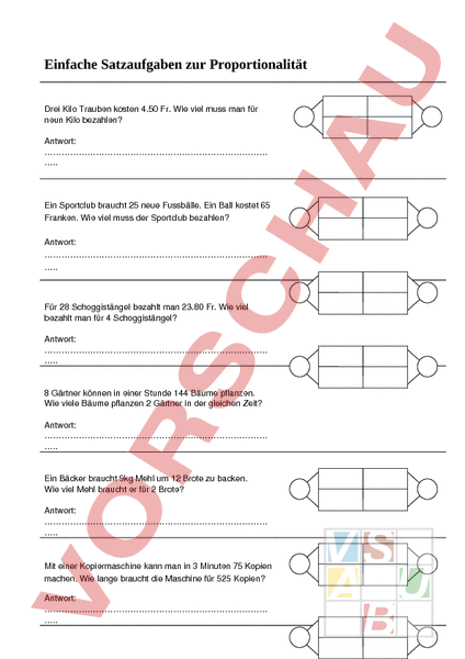 Einfache Satzaufgaben zur Proportionalität Drei Kilo Trauben kosten 4.50 Fr. Wie viel muss man für neun Kilo bezahlen? Antwort: Ein Sportclub braucht 25 neue Fussbälle. Ein Ball kostet 65 Franken. Wie viel muss der Sportclub bezahlen? Antwort: Für 28 Schoggistängel bezahlt man 23.80 Fr. Wie viel bezahlt man für 4 Schoggistängel? Antwort: 8 Gärtner können in einer Stunde 144 Bäume pflanzen. Wie viele Bäume pflanzen 2 Gärtner in der gleichen Zeit? Antwort: Ein Bäcker braucht 9kg Mehl um 12 Brote zu backen. Wie viel Mehl braucht er für 2 Brote? Antwort: Mit einer Kopiermaschine kann man in 3 Minuten 75 Kopien machen. Wie lange braucht die Maschine für 525 Kopien? Antwort: Eine CDRom hat eine Speicherkapazität von 700 MB. Eine Bildersammlung hat die Speichergrösse von 2‘100 MB. Wie viele CDs braucht man, um alle Bilder auf CDs speichern zu können? Antwort: Eine Sekretärin tippt in 3 Minuten 268 Zeichen. Wie viele Zeichen kann sie in einer Viertelstunde tippen? Antwort: Ein Bodenleger verbraucht für den ersten Raum mit 21m Fläche 336 Bodenplatten. Wie viele Platten verbraucht er für den zweiten Raum mit einer Fläche von 7m Antwort: In einer Kleiderfabrik werden für 1000 Hemden 11000 Knöpfe gebraucht. Wie viele Knöpfe werden für 125 Hemden benötigt? Antwort: Ein Flugzeug fliegt in 20min eine Strecke von 185km zurück. Wie weit kommt es in 2 Stunden? Antwort: Drei Konzerttickets kosten 108 Fr. Wie viel würde man für 12 Tickets bezahlen? Antwort: Ein Schwimmer kann in einer halben Stunde einen Kilometer zurücklegen. Wie weit kommt er in 6min? Antwort: Für 12 Farbstifte bezahlt man im Geschäft 10.50Fr. Wie viel bezahlt man für 72 Farbstifte? Antwort: Der Abwart braucht 5 Minuten, um zwei Lampenbirnen auszuwechseln. Wie viele Lampenbirnen kann er in einer Stunde auswechseln? Antwort: Mit einem halben Kilo Teigwaren kann man eine Mahlzeit für 4 Personen kochen. Wie viele Teigwaren muss man für 2 Personen nehmen? Antwort: Herr Wirz hat 63 Most gemacht. Damit kann er 84 Flaschen füllen. Er verkauft 9 Most an einen Kunden. Wie viele Flaschen sind das? Antwort: Wenn Benjamin mit dem Hund der Nachbarn während 30 min spazieren geht verdient er 4 Franken. Wie viel könnte er in 2 Stunden verdienen? Antwort: Die fünf Kühe von Bauer Steffen geben an einem Tag 210 Milch. a) Wie viel Milch gibt jede Kuh pro Tag? Antwort: b) Wie viel Milch geben sie in einer Woche? Antwort: c) Bauer Müller hat 25 Kühe in seinem Stall. Wie viele Liter Milch geben seine Kühe pro Tag? Antwort: