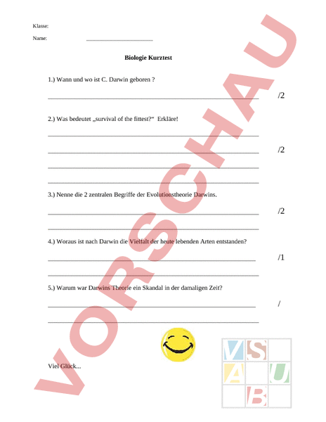 Klasse: Name: Biologie Kurztest 1.) Wann und wo ist C. Darwin geboren /2 2.) Was bedeutet „survival of the fittest? Erkläre! /2 3.) Nenne die 2 zentralen Begriffe der Evolutionstheorie Darwins. /2 4.) Woraus ist nach Darwin die Vielfalt der heute lebenden Arten entstanden? /1 5.) Warum war Darwins Theorie ein Skandal in der damaligen Zeit? Viel Glück.