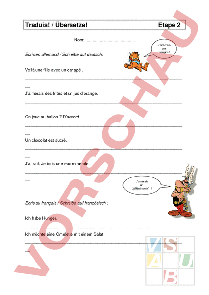 Traduis! Übersetze! Etape 2 Nom: Jaimerais une lasagne! Ecris en allemand Schreibe auf deutsch: Voilà une fille avec un canapé Jaimerais des frites et un jus dorange. On joue au ballon Daccord. Un chocolat est sucré. Jai soif. Je bois une eau minérale. Jaimerais un „Wildschwein !!! Ecris au français Schreibe auf französisch Ich habe Hunger. Ich möchte eine Omelette mit einem Salat. Willst du eine Glace oder ein Karamell? Ich habe Durst. Willst du einen Tee oder ein Coca – Cola? Ich möchte eine Karte. Et toi