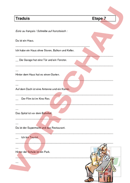 Traduis Etape 7 Ecris au français Schreibe auf französisch Da ist ein Haus. Ich habe ein Haus ohne Storen, Balkon und Keller. Die Garage hat eine Tür und ein Fenster. Hinter dem Haus hat es einen Garten. Auf dem Dach ist eine Antenne und ein Kamin. Der Film ist im Kino Rex. Das Spital ist vor dem Bahnhof. Da ist der Supermarkt und das Restaurant. Ich bin Tourist. Hinter der Schule ist ein Park. Korrigiere dich selber mit dem Lösungsblatt!