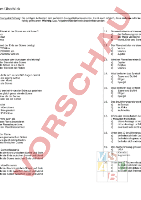 Die Erde im Überblick Hinweise zur Lösung der Prüfung: Die richtigen Antworten sind auf dem Lösungsblatt anzukreuzen. Es ist auch möglich, dass mehrere oder keine der Antworten richtig sind. Die ganze Aufgabe muss jeweils richtig gelöst sein! Wichtig: Das Aufgabenblatt darf nicht beschriftet werden. 01. Welcher Planet ist der Sonne am nächsten? a) Mars b) Merkur c) Venus 11. Sonnenfinsternisse kommen selten vor, weil a) die Entfernung von der Erde zur Sonne zu gross ist b) der Mond viel kleiner ist, als die Sonne c) Mond, Erde und Sonne nicht genau in der gleichen Ebene liegen 02. Der Abstand der Erde zur Sonne beträgt a) 150 00 km b) 150 00 00 km c) 150 00 00 00 km 12. Der Planet mit den meisten Monden heisst a) Venus b) Uranus c) Jupiter 03. Welche Aussage oder Aussagen sind richtig? a) Jeder Stern ist eine Sonne b) Jede Sonne ist ein Stern c) Jeder Stern ist ein Planet 13. Welcher Planet hat einen Dreizack als Symbol? a) Jupiter b) Neptun c) Uranus 04. Die Erde dreht sich in rund 365 Tagen einmal a) um die eigene Achse b) um den Mond c) um die Sonne 14. Was bedeutet das Symbol beim Planeten Mars? a) Speer und Schild b) Flügel c) Spiegel 15. 05. Der Mond erscheint von der Erde aus gesehen a) etwa gleich gross wie die Sonne b) kleiner als die Sonne c) grösser als die Sonne Was bedeutet das Symbol beim Planeten Venus? a) Speer und Schild b) Flügel c) Spiegel 16. 06. Die Venus ist a) der Abendstern b) der Morgenstern c) der Polarstern Das bevölkerungsreichste Land ausserhalb Asiens befindet sich a) in Europa b) in Afrika c) in Amerika 17. 07. Die Erde wird auch als a) blauer Planet bezeichnet b) roter Planet bezeichnet c) grüner Planet bezeichnet China und Indien haben zusammen mehr als die Hälfte der Weltbevölkerung von rund 7 Milliarden Menschen a) diese Aussage ist richtig b) diese Aussage ist falsch c) das lässt sich nicht sagen, weil die Angaben zu ungenau sind 08. Mars ist der Name a) eines germanischen Gottes b) eines griechischen Gottes c) eines römischen Gottes 18. Unter den 10 bevölkerungsreichsten Länder der Erde a) befindet sich kein Land in Afrika b) befindet sich genau ein Land in Afrika c) befinden sich mehrere Länder in Afrika 19. 09. Bei einer Sonnenfinsternis a) steht der Mond zwischen Sonne und Erde b) steht die Erde zwischen Sonne und Mond c) steht die Sonne zwischen Erde und Mond Das flächenmässig grösste Land auf dem amerikanischen Kontinent ist a) USA b) Kanada c) Argentinien 20. 10. Bei einer Mondfinsternis a) steht der Mond zwischen Sonne und Erde b) steht die Erde zwischen Sonne und Mond c) steht die Sonne zwischen Erde und Mond Unter den 10 flächenmässig grössten Staaten der Erde a) befindet sich kein Land in Afrika b) befindet sich genau ein Land in Afrika c) befinden sich mehrere Länder in Afrika