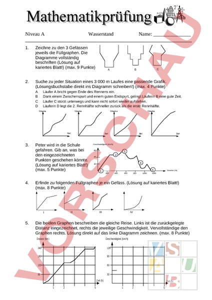 Niveau 1. 2. Wasserstand Zeichne zu den 3 Gefässen jeweils die Füllgraphen. Die Diagramme vollständig beschriften (Lösung auf kariertes Blatt!) (max. 9 Punkte) Läufer bricht gegen Ende des Rennens ein. Dank einem Zwischenspurt und einem guten Endspurt, gelingt Läuferin eine gute Zeit. Läufer stürzt unterwegs und kann nicht sofort wieder aufstehen. Läuferin legt die 2. Rennhälfte schneller zurück als die erste Rennhälfte. Strecke Strecke Strecke Zeit 4. Strecke Zeit Peter wird in die Schule gefahren. Gib an, was bei den eingezeichneten Punkten geschehen könnte. (Lösung auf kariertes Blatt!) (max. 5 Punkte) Zeit Zeit Geschwindigkeit (km/h) 60 3 2 40 4 20 1 5 200 400 600 800 1000 Strecke (m) 1200 Erfinde zu folgenden Füllgraphen je ein Gefäss. (Lösung auf kariertes Blatt!) (max. 8 Punkte) II 5. Suche zu jeder Situation eines 3 000 Laufes eine passende Grafik. (Lösungsbuchstabe direkt ins Diagramm schreiben!) (max. 4 Punkte) B D 3. Name: III IV Die beiden Graphen beschreiben die gleiche Reise. Links ist die zurückgelegte Distanz eingezeichnet, rechts die jeweilige Geschwindigkeit. Vervollständige den Graphen rechts. Lösung direkt auf das linke Diagramm zeichnen. (max. 8 Punkte) Distanz (km) Geschwindigkeit (km/h) 240 120 180 90 120 60 60 30 Zeit (h) 1 2 5 Zeit (h) 1 2 5