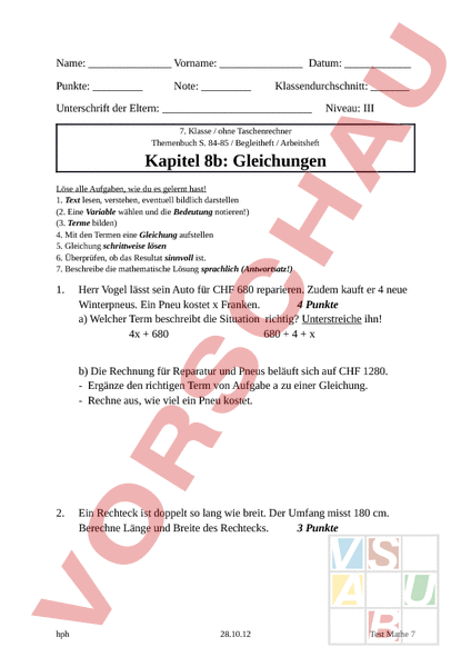 Name: Vorname: Datum: Punkte: Note: Klassendurchschnitt: Unterschrift der Eltern: Niveau: III 7. Klasse ohne Taschenrechner Themenbuch S. 84-85 Begleitheft Arbeitsheft Kapitel 8b: Gleichungen Löse alle Aufgaben, wie du es gelernt hast! 1. Text lesen, verstehen, eventuell bildlich darstellen (2. Eine Variable wählen und die Bedeutung notieren!) (3. Terme bilden) 4. Mit den Termen eine Gleichung aufstellen 5. Gleichung schrittweise lösen 6. Überprüfen, ob das Resultat sinnvoll ist. 7. Beschreibe die mathematische Lösung sprachlich (Antwortsatz!) 1. Herr Vogel lässt sein Auto für CHF 680 reparieren. Zudem kauft er 4 neue Winterpneus. Ein Pneu kostet Franken. 4 Punkte a) Welcher Term beschreibt die Situation richtig? Unterstreiche ihn! 4x 680 680 4 x b) Die Rechnung für Reparatur und Pneus beläuft sich auf CHF 1280. Ergänze den richtigen Term von Aufgabe zu einer Gleichung. Rechne aus, wie viel ein Pneu kostet. 2. Ein Rechteck ist doppelt so lang wie breit. Der Umfang misst 180 cm. Berechne Länge und Breite des Rechtecks. 3 Punkte hph 28.10.12 Test Mathe 7 3. Netzmelonen werden zu Franken das Stück angeboten. Der Küchenchef einer Kantine bestellt 45 Stück. Dazu kommen Milchprodukte für CHF 260 und Backwaren für CHF 85. 5 Punkte a) Welcher Term beschreibt die Kosten richtig? Unterstreiche ihn! 45y 260 85 45 260 85 Begründe deine Antwort: b) Die Rechnung für alles zusammen beläuft sich auf CHF 525. Ergänze den richtigen Term von Aufgabe zu einer Gleichung. Rechne aus, wie viel eine Netzmelone kostet. 4. Die junge Sängerin Lady Gugus bringt ihre erste CD heraus. Für jede verkaufte CD erhält sie CHF 4. Die Herstellerfirma verlangt für die Produktion der CD von der Sängerin CHF 6000. Es werden CDs verkauft. a) Welcher Term beschreibt die Einnahmen der Sängerin richtig? 4 Pkte 4y 6000 4 y 6000 4y – 6000 b) Lady Gugus verdient mit dieser CD insgesamt CHF 42‘000. Ergänze den richtigen Term von Aufgabe zu einer Gleichung. Rechne aus, wie viele CDs verkauft wurden. hph 28.10.12 Test Mathe 7