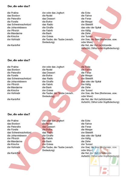Der, die oder das? die Praline das Bonbon die Petersilie die Forelle das Schweinsschnitzel die Johannisbeere der Pfirsich die Mandarine die Kirsche der Kohlrabi der oder das Joghurt die Nudel das Dessert die Butter das Radio die Giraffe die Fabrik die Bank der Griess die Taube, der Taube (versch. Bedeutung) die Ecke die Fahne die Ferse die Wespe der Bleistift das oder der Spital der Käfig die Zehe der Tunnel der See, die See (Bodensee, usw. oder Meer) die Hut, der Hut (schützende Aufsicht, Obhut oder Kopfbdeckung) der oder das Joghurt die Nudel das Dessert die Butter das Radio die Giraffe die Fabrik die Bank der Griess die Taube, der Taube (versch. Bedeutung) die Ecke die Fahne die Ferse die Wespe der Bleistift das oder der Spital der Käfig die Zehe der Tunnel der See, die See (Bodensee, usw. oder Meer) die Hut, der Hut (schützende Aufsicht, Obhut oder Kopfbdeckung) der oder das Joghurt die Nudel das Dessert die Butter das Radio die Giraffe die Fabrik die Bank der Griess die Taube, der Taube (versch. Bedeutung) die Ecke die Fahne die Ferse die Wespe der Bleistift das oder der Spital der Käfig die Zehe der Tunnel der See, die See (Bodensee, usw. oder Meer) die Hut, der Hut (schützende Aufsicht, Obhut oder Kopfbdeckung) die Kartoffel Der, die oder das? die Praline das Bonbon die Petersilie die Forelle das Schweinsschnitzel die Johannisbeere der Pfirsich die Mandarine die Kirsche der Kohlrabi die Kartoffel Der, die oder das? die Praline das Bonbon die Petersilie die Forelle das Schweinsschnitzel die Johannisbeere der Pfirsich die Mandarine die Kirsche der Kohlrabi die Kartoffel