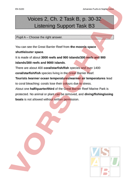 EN S220 Johannes Fuchs Sophie Lüssi Voices 2, Ch. 2 Task B, p. 30-32 Listening Support Task B3 Pupil – Choose the right answer. You can see the Great Barrier Reef from the moon/a space shuttle/outer space. It is made of about 3000 reefs and 900 islands/300 reefs and 900 islands/300 reefs and 9000 islands. There are about 400 coral/starfish/fish species and over 1400 coral/starfish/fish species living in the Great Barrier Reef. Tourists /warmer ocean temperatures/warmer air temperatures lead to coral bleaching: corals lose their colours due to stress. About one half/quarter/third of the Great Barrier Reef Marine Park is protected. No animal or plant can be removed, and diving/fishing/using boats is not allowed without written permission.
