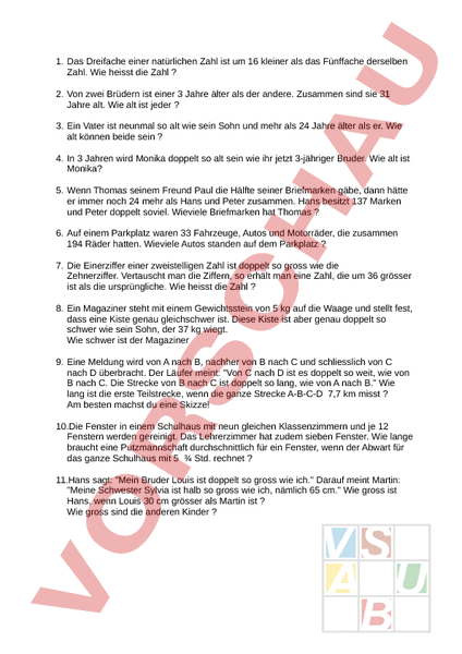 1. Das Dreifache einer natürlichen Zahl ist um 16 kleiner als das Fünffache derselben Zahl. Wie heisst die Zahl 2. Von zwei Brüdern ist einer 3 Jahre älter als der andere. Zusammen sind sie 31 Jahre alt. Wie alt ist jeder 3. Ein Vater ist neunmal so alt wie sein Sohn und mehr als 24 Jahre älter als er. Wie alt können beide sein 4. In 3 Jahren wird Monika doppelt so alt sein wie ihr jetzt 3-jähriger Bruder. Wie alt ist Monika? 5. Wenn Thomas seinem Freund Paul die Hälfte seiner Briefmarken gäbe, dann hätte er immer noch 24 mehr als Hans und Peter zusammen. Hans besitzt 137 Marken und Peter doppelt soviel. Wieviele Briefmarken hat Thomas 6. Auf einem Parkplatz waren 33 Fahrzeuge, Autos und Motorräder, die zusammen 194 Räder hatten. Wieviele Autos standen auf dem Parkplatz 7. Die Einerziffer einer zweistelligen Zahl ist doppelt so gross wie die Zehnerziffer. Vertauscht man die Ziffern, so erhält man eine Zahl, die um 36 grösser ist als die ursprüngliche. Wie heisst die Zahl 8. Ein Magaziner steht mit einem Gewichtsstein von 5 kg auf die Waage und stellt fest, dass eine Kiste genau gleichschwer ist. Diese Kiste ist aber genau doppelt so schwer wie sein Sohn, der 37 kg wiegt. Wie schwer ist der Magaziner 9. Eine Meldung wird von nach B, nachher von nach und schliesslich von nach überbracht. Der Läufer meint: Von nach ist es doppelt so weit, wie von nach C. Die Strecke von nach ist doppelt so lang, wie von nach B. Wie lang ist die erste Teilstrecke, wenn die ganze Strecke A-B-C-D 7,7 km misst Am besten machst du eine Skizze! 10.Die Fenster in einem Schulhaus mit neun gleichen Klassenzimmern und je 12 Fenstern werden gereinigt. Das Lehrerzimmer hat zudem sieben Fenster. Wie lange braucht eine Putzmannschaft durchschnittlich für ein Fenster, wenn der Abwart für das ganze Schulhaus mit 5 Std. rechnet 11.Hans sagt: Mein Bruder Louis ist doppelt so gross wie ich. Darauf meint Martin: Meine Schwester Sylvia ist halb so gross wie ich, nämlich 65 cm. Wie gross ist Hans, wenn Louis 30 cm grösser als Martin ist Wie gross sind die anderen Kinder