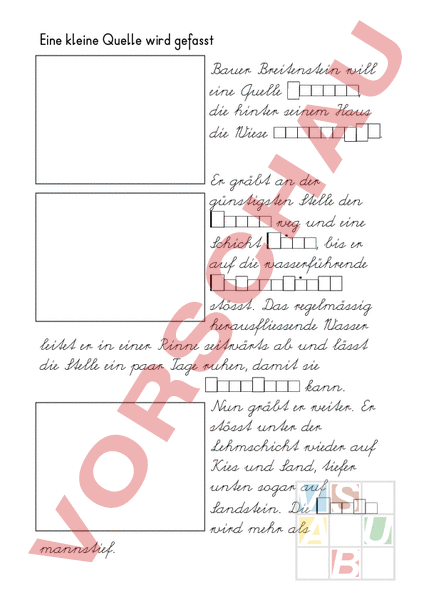 Bilder und Text zeigen das Fassen einer kleinen Quelle. Kinder müssen Bilder richtig zuordnen und Lücken im Text füllen.