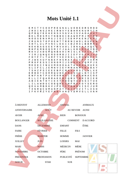 Mots Unité 1.1 Z B Z N R F P S E E L T R E R E K H R L R L I X À BIENTOT D L U K V Y O I B L L N I M N B Z F F F O I A R N D S A X Y E C T F W Q S S T G D L S L C Q D C Z M O S G T S J O A S U R C P E M A I E R M C M E Y O E Q R O M R R O A ALLEMAND ANNIVERSAIRE I N E Y N F N N Q A B N R B H R B Y O V U E Q P N B T V K V M I H E R A V K T A H E I E E B E T Y I R U I V J Y S C C I E B R L M N S M R Q M A B A N I I S D N I R F J H W I B S L U A S X R X R R W N L L X N I T D V K P D A E R E M O B A Z ANIMAL AOÛT U J O A F W Q K N I Y T R M U A C D M I Y D S L AVRIL BOULANGER BOULANGÈRE DANS DÉCEMBRE ENFANT FAIRE FÉVRIER FILLE FRÈRE HABITER HOMME JUILLET JUIN LOISIRS MAI MARI MARS MÉDECIN MÈRE NOVEMBRE OCTOBRE PÈRE PRÉNOM PRÉSENTER PROFESSION PUBLICITÉ SEPTEMBRE STAR I R E C Z F J A S E R S AUSSI AVOIR SOEUR Y Y E Q F E P B I I E X ANIMAUX AU REVOIR BIEN N M L A S O Y Y L R O I BONJOUR COMMENT ACCORD ÊTRE FILS SUR JANVIER H O W Q M X E Y P R O O