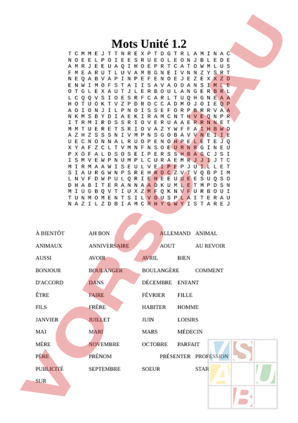 Mots Unité 1.2 N F E L A I A X I S D T O M N C O T Z Y S I H U E E W Q I R H A M A A N E A I Q O M Z F V U B M L R M V N I S Z E R I O P U O S J R S C W G T M O T F I I D S L P W E E I L S O L S N T N N R N E U T E P S I V U P A T E V A S N R V M M S N S S A I R O I M N P R N I R M I F I O P F L E A L U B S C S V N N C H A V E G A A S E S S U R D O O N V R E R G O R D K U L E A L F U O E A C U S E I O T O A B U E Z M P O V D U R A A R M V L L N N A Q P E V N R T E A J N N H B R V R J V T I B Z S G R R N G J Q M T L Y I N R N E I I B P E E S M E V N I N J P D R À BIENTÔT AH BON ALLEMAND ANIMAL ANIMAUX ANNIVERSAIRE AOUT AUSSI AVOIR AVRIL BONJOUR BOULANGER BOULANGÈRE DACCORD DANS DÉCEMBRE ENFANT ÊTRE FAIRE FÉVRIER FILLE FILS FRÈRE HABITER HOMME JANVIER JUILLET JUIN LOISIRS MAI MARI MARS MÉDECIN MÈRE NOVEMBRE OCTOBRE PARFAIT PÈRE PRÉNOM PUBLICITÉ SEPTEMBRE SUR D R L A A E I E T I S A E T E A A T E U C M N U AU REVOIR BIEN COMMENT PRÉSENTER PROFESSION SOEUR STAR CEST DE LA PART DE QUI JE TÉLÉPHONE POUR LANNONCE NE QUITTEZ PAS SIL VOUS PLAÎT TOUT À FAIT UN INSTANT SIL VOUS PLAÎT UN MOMENT SIL VOUS PLAÎT