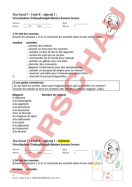 Test Envol 7 Unité 8 – objectif 1 Verschiedene Einkaufsmöglichkeiten kennen lernen Prénom Points 30 Note: Nom: Niveau: 2 1 On fait les courses. Ecoute les phrases 1 à 11 et numérote les activités dans le bon ordre. (10p.) nombre 1. activités .acheter des timbres. .acheter un livre pour les vacanes. . acheter un litre de lait et des légumes. . rendre les stylo qui ne va pas. . commander de la viande pour samedi. . acheter un gâteau pour ton frère. .chercher des croissants. .déposer lordonnance pour des antiobiotiques. . acheter un bouquet de tulipes pour ta maman. . reserver und table pour lanniversaire de ton frère. . chercher le journal daujourdhui. 2 Les petits commerces Tu vas faire les achats. Dans quel magasin est-ce que tu achètes ces articles? Ecoute les articles et écrit les nombres des articles à côté du magasin. (20p.) Magasin à lépicerie à la boulangerie à la papeterie à la pharmacie à la boucherie chez la fleuriste au magasin de sport à la parfumerie à la poste à la pâtisserie au restaurant à la librairie Nombre de larticle Test Envol 7 Unité 8 – objectif 1 Solutions Verschiedene Einkaufsmöglichkeiten kennen lernen Prénom Points 30 Note: Nom: Niveau: 2 1 On fait les courses. Ecoute les phrases 1 à 11 et numérote les activités dans le bon ordre. (10p.) nombre 1 activités Envol 7, Unité 8, obj. 1, HÖRVERSTÄNDNIS, kavo 10/12 3 11 4 8 2 6 9 10 5 7 1. .acheter des timbres. .acheter un livre pour les vacanes. . acheter un litre de lait et des légumes. . rendre les stylo qui ne va pas. . commander de la viande pour samedi. . acheter un gâteau pour ton frère. .chercher des croissants. .déposer lordonnance pour des antiobiotiques. . acheter un bouquet de tulipes pour ta maman. . reserver und table pour lanniversaire de ton frère. . chercher le journal daujourdhui. 2 Les petits commerces Tu vas faire les achats. Dans quel magasin est-ce que tu achètes ces articles? Ecoute les articles et écrit les nombres à côté du magasin. (20p.) Magasin à lépicerie à la boulangerie à la papeterie à la pharmacie à la boucherie chez la fleuriste au magasin de sport à la parfumerie à la poste à la pâtisserie au restaurant à la librairie Nombre de larticle 4. des oranges, 8. des légumes, 13. de la farine 2. du pain, 6. des croissants 10. un cahier, 15. un stylo 14. de laspirine 12. des côtelettes, 16. des saucisses 1. des roses, 18. un bouquet de fleurs 20. les planches à roulettes 7. un parfum 5. des timbres 9. une tarte aux pommes, 17. un gâteau 3. un café 11. un livre, 19. un dictionnaire Satzanfänge zum Vorlesen für Aufgabe 1 On fait les courses. 1. Tu arrives en ville et tu passes au bureau de tabac pour 2. Maintenant, tu vas à la boucherie pour 3. Tu vas à la poste pour 4. lépicerie, tu vas 5. Après, tu vas chez le fleuriste pour 6. côté, à la pâtisserie, tu dois encore 7. Et au restaurant tu veux encore 8. Puis, de lautre côté de la rue, tu entres dans la papeterie, pace que tu dois 9. Et à la boulangerie tu vas. 10. Ensuite, tu passes à la pharmacie où tu dois 11. la fin, tu vas à la librairie pour. Artikel zum Vorlesen für Aufgabe 2 Les petits commerces 1. des roses 2 2. du pain 3. un café 4. des oranges 5. des timbres 6. des croissants 7. un parfum 8. des légumes 9. une tarte aux pommes 10. un cahier 11. un livre 12. des côtelettes 13. de la farine 14. de laspirine 15. un stylo 16. des saucisses 17. un gâteau 18. un bouquet de fleurs 19. un dictionnaire 20. des planches à roulettes 3 Envol 7, Unité 8, obj. 1, HÖRVERSTÄNDNIS, kavo 10/12