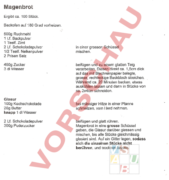 Magenbrot 500g Ruchmehl 1 Lt. Backpulver 1 Teelf. Zimt 2 Lt. Schokoladepulver 1/2 Teelf. Nelkenpulver 2 Prisen Salz 450g Zucker 3 dl Wasser Glasur 1OOgKochschokolade 20g Butter knapp 1 dl Wasser 2 Lt. Schokoladepulver 300g Puderzucker in einer grossen SchOssel mischen. beifOgen und zu einem glatten Teig verarbeiten. Diesen direkt ca. 1,5cm dick auf das mit Blechreinpapier belegte, grosse, rechteckige Backblech streichen. Wahrend ca. 20 Minuten backen, etwas auskOhlen lassen und dann in Stocke von ca. 2x4cm schneiden. bei massiger Hitze in einer Pfanne schmelzen, yom Herd nehmen. beifOgen und glatt rOhren. Magenbrot in eine grosse SchOssel geben, die Glasur darOber giessen und mischen, bis aile Stocke gleichmassig glasiert sind. Auf ein Gitter legen, sodass sich die einzelnen StUcke nicht beriihren, und trocknen lassen.