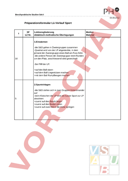 Berufspraktische Studien Sek 04.09.2012 Präparationsformular Lü-Verlauf Sport SF LZ Nr. Lektionsgliederung didaktisch-methodische Überlegungen 1.Einwärmen 10 -die S&S gehen in Zweiergruppen zusammen -Quadrat wird von der LP abgesteckte, in dem jemand der Zweiergruppe einen Ball am Fuss führt. -die andere Person der Zweiergruppe rennt Runden um den Platz, anschliessend wird gewechselt -Bei Pfiff der LP: auf den Ball sitzen auf dem Ball Liegestützen machen mit dem Ball Rumpfbeugen machen 2.Spurteinlagen 5 -die S&S stellen sich in zwei Gruppen hintereinander auf -beim Klatschen der LP wird ein kurzer Spurt zur LP absolviert zuerst auf den Bauch liegen zuerst auf den Boden sitzen zuerst auf zwei Mal in die Höhe springen Medien Material Berufspraktische Studien Sek 04.09.2012 SF LZ Nr. Lektionsgliederung didaktisch-methodische Überlegungen Medien Material 3.Torschussgenauigkeit -in den zwei Toren werden Malstäbe hineingesetzt -alle S&S haben einen Ball, jede/r hat einen Schuss -in den Ecken des Tores gibt es zwei Punkte, in der Mitte einen Punkt -welche Gruppe hat mehr Punkte 15 jede/r S&S hat einen Schuss Ball erst holen, wenn alle S&S geschossen haben -sechs Malstäbe -16 Fussbälle -zusätzlich zu den Malstäben werden dazwischen noch Töggeli aufgestellt Treffer eines Töggelis 3 Punkte in die Ecken 2 Punkte in die Mitte 1 Punkt Tor verfehlt 0 Punkte -sechs Töggeli -zwei Fussballtore 4.Torschusstraining -freiwilliger Torhüter, ansonsten ohne Torhüter -S&S setzen sich den Ball, alle auf ein Tor Mädchen können sich den Ball weiter vorne setzen als die Knaben 10 Alle schiessen mit dem stärkeren Fuss: Innenrist Aussenrist Vollrist und versuchen ein Tor zu machen -16 Fussbälle -ein Fussballtor Alle schiessen mit dem schwächeren Fuss -Bälle werden erst geholt, wenn alle geschossen haben 5.Abschlussspiel 5 -die S&S spielen 8:8 auf ein grosses Feld mit den beiden Fussballtoren -zwei Fussballtore -ein Fussball