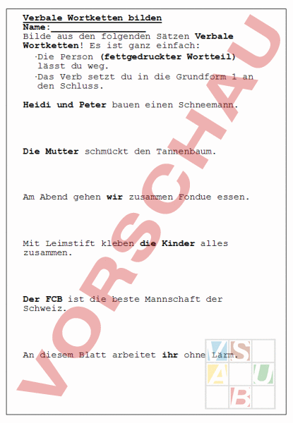 Verbale Wortketten bilden Name:_ Bilde aus den folgenden Sätzen Verbale Wortketten! Es ist ganz einfach: Die Person (fettgedruckter Wortteil) lässt du weg. Das Verb setzt du in die Grundform 1 an den Schluss. Heidi und Peter bauen einen Schneemann. Die Mutter schmückt den Tannenbaum. Am Abend gehen wir zusammen Fondue essen. Mit Leimstift kleben die Kinder alles zusammen. Der FCB ist die beste Mannschaft der Schweiz. An diesem Blatt arbeitet ihr ohne Lärm. Bei ihnen läuft der Fernseher jeden Abend. Der Rhein fliesst durch Basel.