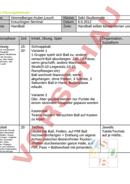 Sport Planungsformular Name: Ort: Thema: Himmelberger,Huber,Leuch Kreuzlingen Seminar Handball Klasse: SekI-Studierende Anzahl Md/ Kn: Datum 6.6.2012 Zeit: 15.30-17.00 Ziele: Handball selber kennenlernen und didaktische Möglichkeiten Lektionsphase Zeit Inhalt, Übung, Spiel Einleitung 1520 Schnappball. Variante 1 1 Gruppe spielt sich Ball zu, andere versucht Ball abzufangen. Ziel: 10 Pässe, wenn geschafft, andere Mannschaft Strafe(5-10 Liegestütz,10-15 Rumpfbeugen,etc) Ball wechselt Mannschaft, wenn abgefangen, ohne Prellen, 3 Schritte, 3 Sekunden Ball in Hand, Bodenpässe erlaubt. Psychisch und physisch auf den Hauptteil vorbereitend, Ritualisierte Formen der Stundeneröffnung. Über Inhalt/ Ziele orientieren. Alle bewegen sich! Organisation, Sozialform Material Lehrerinnentätigkeit Valentin Variante 2 Dito. Aber gezählt werden nur Punkte die einem sitzenden Mitspieler gepasst werden Kastenball Teams müssen Versuchen Ball auf Kasten zu legen Hauptteil Hauptthema der Stunde zielorientiert behandeln und erarbeiten. Niveau berücksichtigen: mögliche Lernstufen: Erwerben Anwenden, Üben, Trainieren, Festigen, Gestalten und Variieren. Durchdachte Organisation mit möglichst wenigen 25 Technik: -Jeder hat Ball, Prellen, auf Pfiff Ball hochwerfen/fangen Drehung um eigene Achse/ zwischen Beinen/hinter Rücken -Prellen durcheinander ganze Halle, auf Pfiff, Pass Ballwechsel mit jemandem. Jeweils Taktik/Technik auf je Hälfte Martin SchülerInnentätigkeit Sport Planungsformular Wartezeiten. Mögliche Lehrertätigkeiten: Vorzeigen, Beobachten, Helfen, Sichern, beurteilen, beraten, schiedsrichten, erklären usw. am Schluss: Lernziel erreicht? Zuerst Blickkontakt! Königsprellen Ballverlust bedeutet Wechsel ins nächste Feld. Beginn in oberstem Spielfeld. Jeder versucht während Prellen, dem anderen den Ball wegzuspielen. Bis nur noch 1 Spieler im obersten Feld oder Zeit vorbei. An Mittellinie mit Partner 2-4m Abstand, Bälle passen(beide oben, einer via Boden, ein Ball am Fuss, falsche Hand, Kernwurf, auf Schnelligkeit) Kleiner Wettbewerb: zu zweit 1 Ball, an Mittellinie, jeweils Pass hin und zurück, wenn angekommen beide 1 Linie nach hinten, wenn nicht 1 Linie nach vorne. Wer ist zuerst ganz an hinterster (Grund-) Linie? Täuschen: Vorzeigen. Als Rundlauf 1x mit Reifen am Boden, 1x mit Massstäbe 2 „Passeure Abschluss auf Tor 20 Taktik: Ziel: Überzahlsituation 2:2, 3:2, 3:3,usw. (je nach Anzahl Leuteintensität) Mit/ohne Kreisläufer bzw. Einläufer Trockenübung Handball(Ball von links nach rechts) Roman Sport Planungsformular Ausklang Klasse besammeln und mit unterschiedlichen Zielsetzungen (z.B. Beruhigen, Cool down, Demo der Zielform etc.) die Unterrichtsstunde abrunden und auf den Abschluss hin orientieren, nicht nur Aufräumen weiterführende Notizen. Ausblick auf die nächst Stunde. 5 Ev. Gegenstoss (je nach Zeit) 20 Spiel 6: bei 18 oder mehr Leuten: 3 Mannschaften: Angriff Verteidigung Angriff VMR Passeur RM alle