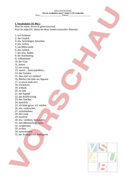 Stiftsschule Einsiedeln Test de vocabulaire envol 7 unités 1-4 traduction Nom:_ Prénom:_ I. Vocabulaire (35 Pkt.) Pour les noms: donne le genre (un/une) Pour les adjectifs: donne les deux formes (masculin/ féminin) 1. sich bräunen 2. das Gepäck 3. etw. besichtigen, besuchen 4. jdn. treffen 5. um Mitternacht 6. etw. mieten 7. jdn./etw. finden 8. der Nachmittag 9. willkommen 10. der Gast 11. lernen 12. ein wenig 13. zuerst., dann (nachher). 14. das Gemüse 15. Wen darf ich melden? 16. Bleiben Sie bitte am Apparat 17. in etwas stark sein 18. erwachsen 19. schlank 20. zu spät 21. die Jugend 22. das Krafttraining 23. das Tauchen 24. sportlich 25. ich hätte gerne, ich möchte 26. etw. vermischen 27. zurückkehren 28. die Leute 29. berühmt 30. etw. verehren, bewundern 31. lieb (Briefanfang), teuer 32. vergleichen 33. erraten 34. nummerieren 35. der Anfänger/die Anfängerin Stiftsschule Einsiedeln Test de vocabulaire envol 7 unités 1-4 traduction Nom:_ Prénom:_ Traduction (20 Pkt.) 1. Sie hat dieses Rennen schon dreimal gewonnen. 2. Ein Herr nimmt Fleisch mit Reis und Wein. 3. Wie alt sind Sie? 4. Ich, ich habe einen Film im Kino geschaut. 5. Nachher bin ich in die Disco gegangen. 6. Ihre Mutter findet, dass es zu spät ist. 7. Es hat viele Touristen in Zürich. 8. Es braucht viel Mut für dieses Abenteuer. 9. Vor (zeitlich) dem Essen, muss man den Tisch decken. 10. Er hat viele Pommes Frites gegessen aber wenig Nudeln.