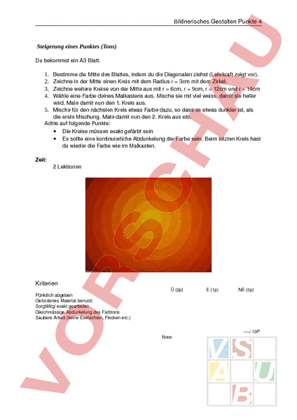 Bildnerisches Gestalten Punkte 4 Steigerung eines Punktes (Tons) Du bekommst ein A3 Blatt. 1. 2. 3. 4. Bestimme die Mitte des Blattes, indem du die Diagonalen ziehst (Lehrkraft zeigt vor). Zeichne in der Mitte einen Kreis mit dem Radius 3cm mit dem Zirkel. Zeichne weitere Kreise von der Mitte aus mit 6cm, 9cm, 12cm und 14cm Wähle eine Farbe deines Malkastens aus. Mische sie mit viel weiss, damit sie heller wird. Male damit nun den 1. Kreis aus. 5. Mische für den nächsten Kreis etwas Farbe dazu, so dass es etwas dunkler ist, als die erste Mischung. Male damit nun den 2. Kreis aus etc. Achte auf folgende Punkte: • Die Kreise müssen exakt gefärbt sein • Es sollte eine kontinuierliche Abdunkelung der Farbe sein. Beim letzten Kreis hast du wieder die Farbe wie im Malkasten. Zeit: 2 Lektionen Kriterien Pünktlich abgeben Gefordertes Material benutzt Sorgfältig/ exakt gearbeitet Gleichmässige Abdunkelung des Farbtons Saubere Arbeit (keine Eselsohren, Flecken etc.) Ü (2p) Note: (1p) NE (0p) / 10P