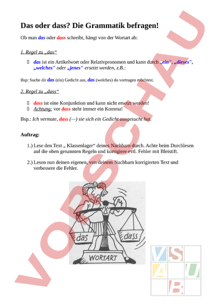 Das oder dass? Die Grammatik befragen! Ob man das oder dass schreibt, hängt von der Wortart ab: 1. Regel zu „das das ist ein Artikelwort oder Relativpronomen und kann durch „ein, „dieses, „welches oder „jenes ersetzt werden, z.B.: Bsp: Suche dir das (ein) Gedicht aus, das (welches) du vortragen möchtest. 2. Regel zu „dass dass ist eine Konjunktion und kann nicht ersetzt werden! Achtung: vor dass steht immer ein Komma! Bsp.: Ich vermute, dass (—) sie sich ein Gedicht ausgesucht hat. Auftrag: 1.) Lese den Text „ Klassenlager deines Nachbarn durch. Achte beim Durchlesen auf die oben genannten Regeln und korrigiere evtl. Fehler mit Bleistift. 2.) Lesen nun deinen eigenen, von deinem Nachbarn korrigierten Text und verbessere die Fehler.