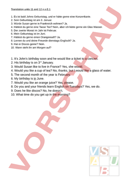 Translation units 11 and 12 n.s.E.1 1. Es ist bald Johns Geburtstag, und er hätte gerne eine Konzertkarte. 2. Sein Geburtstag ist am 3. Januar. 3. Würde Susan gerne in Frankreich wohnen? Ja. 4. Hättest du gerne eine Tasse Tee? Nein, aber ich hätte gerne ein Glas Wasser. 5. Der zweite Monat im Jahr ist Februar. 6. Mein Geburtstag ist im Juni. 7. Hättest du gerne einen Orangensaft? Ja. 8. Lernen du und deine Freunde dienstags Englisch? Ja. 9. Hat er Discos gerne? Nein. 10. Wann steht ihr am Morgen auf? 1. Its Johns birthday soon and he would like ticket to concert. 2. His birthday is on 3rd January. 3. Would Susan like to live in France? Yes, she would. 4. Would you like cup of tea? No, thanks, but would like glass of water. 5. The second month of the year is February. 6. My birthday is in June. 7. Would you like an orange juice? Yes, please. 8. Do you and your friends learn English on Tuesdays? Yes, we do. 9. Does he like discos? No, he doesnt. 10. What time do you get up in the morning?