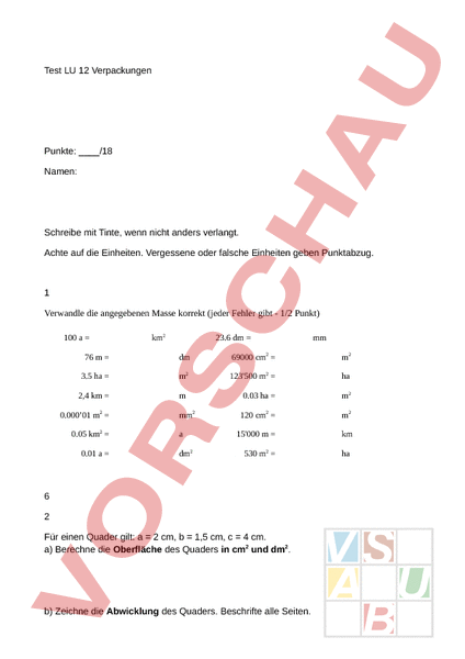 Test LU 12 Verpackungen Punkte: /18 Namen: Schreibe mit Tinte, wenn nicht anders verlangt. Achte auf die Einheiten. Vergessene oder falsche Einheiten geben Punktabzug. 1 Verwandle die angegebenen Masse korrekt (jeder Fehler gibt 1/2 Punkt) 100 km2 23.6 dm mm 76 dm 69000 cm2 m2 3.5 ha m2 123500 m2 ha 2,4 km 0.03 ha m2 120 cm2 m2 15 00 km 0.00001 m2 0.05 km2 0.01 mm2 dm2 530 m2 6 2 Für einen Quader gilt: 2 cm, 1,5 cm, 4 cm. a) Berechne die Oberfläche des Quaders in cm2 und dm2. b) Zeichne die Abwicklung des Quaders. Beschrifte alle Seiten. ha 4 3 Eine Kartonschachtel ist 15 cm breit, 3 dm lang und 8 cm hoch. Wie viele cm 2 Folie werden für das Überziehen der Schachtel gebraucht? 1 4 a) Ein Zimmer (Länge 7 m, Breite 5 m, Höhe 3 m) soll blau gestrichen werden. Wie viele Quadratmeter müssen bemalt werden, wenn ausser den Wänden auch die Decke blau werden soll? b) An einen Würfel (s5cm) wird ein Quader (a2cm, b3cm, c3cm) so angeklebt, dass die grösste Fläche den Würfel berührt. Wie gross ist die Oberfläche des neuen Körpers? Mach eine Skizze! 3 5 Berechne die Höhe der Quader, für die gilt: a) 4 cm, 6 cm, Mantel 50 cm2 b) 16dm, 24dm, die Mantelfläche ist doppelt so gross wie die Grundfläche. 2 6 Gegeben ist der folgende Quader: Länge 8 cm Breite 5 cm Höhe 3 cm a) Berechne die Mantelfläche des Quaders b) Wie lange sind alle Kanten des Quaders zusammen? 2 Viel Erfolg! Test LU 12 Verpackungen Punkte: /21 Namen: Schreibe mit Tinte, wenn nicht anders verlangt. Achte auf die Einheiten. Vergessene oder falsche Einheiten geben Punktabzug. 1 Verwandle die angegebenen Masse korrekt 100 0,01 km2 76 760 3.5 ha 35 00 2,4 km 2400 0.00001 m2 10 0.05 km2 500 0.01 100 23.6 dm 2360 mm dm 69000 cm2 6,9 m2 m2 123500 m2 12,35 ha mm2 dm2 0.03 ha 300 m2 120 cm2 0,012 m2 15 00 15 530 m2 0,053 7 2 Für einen Quader gilt: 2 cm, 1,5 cm, 4 cm. a) Berechne die Oberfläche des Quaders in cm2 und dm2. Oberfläche 34 cm2 0,34 dm2 b) Zeichne die Abwicklung des Quaders. Beschrifte alle Seiten. km ha 4 3 Eine Kartonschachtel ist 15 cm breit, 3 dm lang und 8 cm hoch. Wie viele cm 2 Folie werden für das Überziehen der Schachtel gebraucht? 1620 cm2 2 4 a) Ein Zimmer (Länge 7 m, Breite 5 m, Höhe 3 m) soll blau gestrichen werden. Wie viele Quadratmeter müssen bemalt werden, wenn ausser den Wänden auch die Decke blau werden soll? Blau 107 m2 b) An einen Würfel (s5cm) wird ein Quader (a2cm, b3cm, c3cm) so angeklebt, dass die grösste Fläche den Würfel berührt. Wie gross ist die Oberfläche des neuen Körpers? Mach eine Skizze! Oberfläche Würfel 150 cm2, Oberfläche Quader 42 cm2, Oberfläche Körper A B 2 9cm2 174 cm2 3 5 Berechne die Höhe der Quader, für die gilt: a) 4 cm, 6 cm, Mantel 50 cm2 z 2,5 cm b) 16dm, 24dm, die Mantelfläche ist doppelt so gross wie die Grundfläche. z 9,6 cm 2 6 Gegeben ist der folgende Quader: Länge 8 cm Breite 5 cm Höhe 3 cm a) Berechne die Mantelfläche des Quaders. Mantelfläche 78 cm2 b) Wie lange sind alle Kanten des Quaders zusammen? Kantenlänge 4a 4b 4c 64 cm 3 Viel Erfolg!