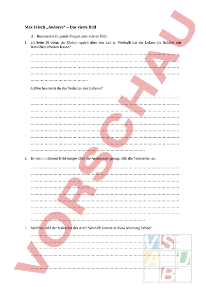 Max Frisch „Andorra – Das vierte Bild A. Beantworte folgende Fragen zum vierten Bild. 1. a.) Seite 38 oben; der Doktor sprich über den Lehrer. Weshalb hat der Lehrer die Schüler mit Rotstiften arbeiten lassen? b.)Wie beurteilst du das Verhalten des Lehrers? 2. Es wird in diesem Bild einiges über die Andorraner gesagt. Gib die Textstellen an. 3. Welches Bild der Juden hat der Arzt? Weshalb könnte er diese Meinung haben? 4. Wie reagiert der Lehrer auf die Heiratspläne? Wie wirkt das auf Andri? . 5. Versetze dich in Andris Lage. Was würdest du tun? Würde sich dein Selbstbild ändern?