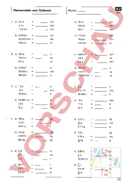 Verwandeln von Grössen 1. a) 23m ) 5 1m 5km dm 0.9 cnr T2 6d mm 64m b) 0.09km 24 000mm 2 9c dnr 205km: 8.3a ) 0.3km 26000a 1 9h 1 3h ai 4 a 290g 1.57 ha 0.8a l 362 m: km: 75 000dm: na ) 2a iL, min na 2d7h mn 68 400 15s min 11h mtn 37s kg ) 5.27g Kg 9 mg 9-1 mg kg mg 0.0073 kg 86 mg kg t kg 0.41 ha 1 6k n 1.2r 0.45g 5. a) 2 l dm 0.2a 4.28ks ) 0.3ks dm ) 5000m? 75 600s DJ 24 480min kra 0.4 mm 290 dm 3 a T 3d AA1 78 dm 730cm 2 a 43ha Name: cl ml ;dl d) ) 0.38h mg ol it ml 29 450ml 94 cl 2 1 1 hl 5 6m ol 6.9 ml cl *nr ol -tl cl 245