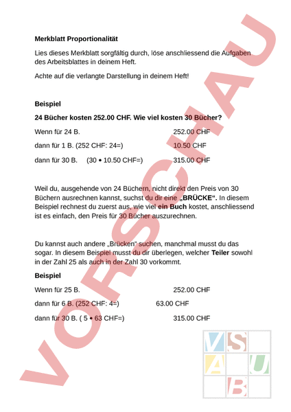 Merkblatt Proportionalität Lies dieses Merkblatt sorgfältig durch, löse anschliessend die Aufgaben des Arbeitsblattes in deinem Heft. Achte auf die verlangte Darstellung in deinem Heft! Beispiel 24 Bücher kosten 252.00 CHF. Wie viel kosten 30 Bücher? Wenn für 24 B. 252.00 CHF dann für 1 B. (252 CHF: 24) 10.50 CHF dann für 30 B. (30 • 10.50 CHF) 315.00 CHF Weil du, ausgehende von 24 Büchern, nicht direkt den Preis von 30 Büchern ausrechnen kannst, suchst du dir eine „BRÜCKE. In diesem Beispiel rechnest du zuerst aus, wie viel ein Buch kostet, anschliessend ist es einfach, den Preis für 30 Bücher auszurechnen. Du kannst auch andere „Brücken suchen, manchmal musst du das sogar. In diesem Beispiel musst du dir überlegen, welcher Teiler sowohl in der Zahl 25 als auch in der Zahl 30 vorkommt. Beispiel Wenn für 25 B. dann für 6 B. (252 CHF: 4) dann für 30 B. 5 • 63 CHF) 252.00 CHF 63.00 CHF 315.00 CHF