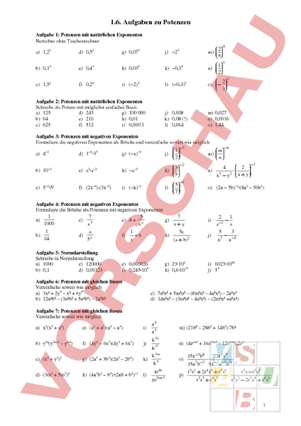 1.6. Aufgaben zu Potenzen Aufgabe 1: Potenzen mit natürlichen Exponenten Berechne ohne Taschenrechner 4 a) 1,22 d) 0,52 g) 0,072 j) 23 m) 2 5 b) 0,13 e) 0,43 h) 0,034 k) 0,34 n) 1 2 c) 1,52 f) 0,24 i) (2)3 l) (0,3)3 o) 2 3 j) 0,008 k) 0,08 (!) l) 0,064 m) 0,027 n) 0,0016 o) 1,44 3 3 Aufgabe 2: Potenzen mit natürlichen Exponenten Schreibe als Potenz mit möglichst einfacher Basis a) 125 d) 243 g) 100 000 b) 64 e) 216 h) 0,01 c) 625 f) 512 i) 0,000 1 Aufgabe 3: Potenzen mit negativen Exponenten Formuliere die negativen Exponenten als Brüche und vereinfache soweit wie möglich a) 42 b) 10 3 c) 55·51 d) 34·35 3 e) ·a 2 f) (2x4):(3x5) 1 2 h) u k) 3 5 i) (k)2 l) 5 7 m) m n) 2 2 y2 2 3 1 Aufgabe 6: Potenzen mit gleichen Basen Vereinfache soweit wie möglich a) 3x 2y4 – x 6y4 b) 12ab – (3ab 5ab) – 2ab i) z2 2 5 j) g) 23·102 h) 0,6·105 e) 0,000026 f) 0,245·104 2 4 o) (2a 5b)2·(8a2 50b2) Aufgabe 4: Potenzen mit negativen Exponenten Formuliere die Brüche als Potenzen mit negativen Exponenten 1 5 7 7 a) c) e) 4 n g) 3 1000 xy x 1 1 5c b) d) f) 6 h) 64 5 (a b)2 Aufgabe 5: Normdarstellung Schreibe in Normdarstellung a) 1000 c) 120000 b) 0,1 d) 0,00123 k 3 j) g) (x)6 2 1 3 4 i) 6023·1020 j) 53 c) 7ax 5mn – (8mn – 4ax) – 2ax d) 14ax – (3mn – 4ax) – (2mn ax) Aufgabe 7: Potenzen mit gleichen Basen Vereinfache soweit wie möglich a) x2(x3 x4) e) (a2 a3)(a2 a3) i) b) y2a(y3a1 – ya-4) f) (4y3 6x7)(4y3 6x7) j) c) (x2 y3)2 g) (2a5 3b3)(2a3 – 2b4) k) d) (3m2 5m7)2 h) (4a2b3 b5)·(2ab b2)1 l) a9 a5 23 17 2m k3 4b 2b7 m) (21b8 – 28b4 14b5):7b n) (4za3 16z2a5 – 12za4):2za o) p) 15x5 b8 21x 3 y4 35a 7 b2 9x2 3 b10 3 2 2r 4 4 r 5 s6 3 s3 r 4 s5 2 3 s3 2 2 2r 3 4 r 4 s6 1 Aufgabe 8: Potenzen mit gleichen Exponenten Vereinfache soweit wie möglich a) 44 34 0, 254 c) (x y)8 (x y)8 e) b) 5x 4 d) (x)5 (y)5 z5 f) 24 3 83 2,6 4 1,3 0, 42 g) 0, 52 (12x m h) 4 (3x 27a 3 i) 8b3 (2a 3b)5 j) (16x 4 25y2 n 5 (4x 2 n k) (16r 4 24r 2 s3 9s 6 )4 l) (4a 2 9b 2 )5 (16r 4 9s6 )4 Aufgabe 9: Potenzen von Potenzen Vereinfache soweit wie möglich d) (x3)m 3 5 2 b) (10 g) (5a2b7)4 3 4 j) 4 5 4 e) (y h) 5(m ) k) 5a b 10p 7 3 (8n) n 0 8 a1 y1 n) 8a 4 2 27a 5 9a 2 2 · 4yb (3a 5 2 4 4(xy1 )3 2 5 3 2 3 4 c) (a f) (x ) 4ab 2x 4 y3 o) 2 b2 3 (x y) i) l) 2 6a 6 8 4 (2x2 2 )3 2 m) 10 a) (23)4 · n 2 yn 3 a) b) 1 43 c) 2 43 d) 3 x4 e) 2 b5 f) 2 (3x 3 g) h) i) y b j) 1 3 2 3 k) 1 16 2 l) 1 27 3 (a b)m 6 · (a b)m (x y)m 64 2 m) 2 83 n) 3 100 2 o) 2 2 · 3 3 b ((x 2 y2 m )3 Aufgabe 10: Die n-te Wurzel Berechne ohne Taschenrechner: a) 3 8 b) 4 10000 c) 10 1024 d) 5 1024 e) 3 64 f) Aufgabe 11: Potenzgesetze und n-te Wurzel Formuliere die Potenzen als Wurzeln und berechne ohne Taschenrechner, wenn möglich. 1 32 n1 p) 27 3 64 q) 27 3 125 1 3 9 2 16 r) 25 2 49 2 Aufgabe 12: Potenzgesetze und n-te Wurzel Formuliere die Wurzeln als Potenzen und vereinfache soweit wie möglich. a) b) 4 d) e) 7 3 a 1 1 g) 3 x h) 3 x4 4 x5 j) 7 55 3 52 m) k) 5 y3 4 y5 n) 4 p) 3 5 4 q) 2 ax x 16 9 64 i) :3a l) 9 9 o) 625 r) 3n (a 4b)3 (a 4 ab 4b)3 x Aufgabe 13: Potenzgesetze Vereinfache soweit wie möglich und gib jeweils die benutzte Regel oder Definition an. c) 5 x4 f) 5 7 a) b) c) 4 3 16 3 2 3 b2 5 2 32 d) e) f) 2 9 18 3 x9 2 x3 3 3 g) 5 x9 5 3x 3 3 7 3 y 5 8 b0 4 h) x i) 1 1 y 1 1 y x x8 4 Aufgabe 14: Potenzgleichungen Bestimme die Lösungsmenge der folgenden Gleichungen. a) x4 16 e) xn a mit 0 und gerade 4 b) 16 f) xn a mit 0 und gerade 3 c) 16 g) xn a mit 0 und ungerade 3 d) 16 h) xn a mit 0 und ungerade 2 j) 12b 2 x k) 5a 24b 2 30ac 2v 2 6v 2 2 l) (u v) 1 i) j) k) l) 2 4uv (u v) 2 x4 162 0 (x 3)4 16 0 3(x 2)3 24 0 5(x 2)3 135 0 2 1.6. Lösungen zu den Aufgaben zu Potenzen Aufgabe 1: Potenzen mit natürlichen Exponenten a) 1,44 d) 0,25 g) 0,0049 j) 8 b) 0,001 e) 0,064 h) 0,000 00081 k) 0,0081 c) 2,25 f) 0,0016 i) 8 l) 0,0081 Aufgabe 2: Potenzen mit natürlichen Exponenten a) 53 d) 35 g) 105 6 3 b) 2 e) 6 h) 0,12 4 9 c) 5 f) 2 i) 0,14 16 625 1 n) 8 8 o) 27 m) j) 0,23 k) 0,081 l) 0,43 m) 0,33 n) 0,24 o) 1,22 j) 8 m) Aufgabe 3: Potenzen mit negativen Exponenten a) 1 16 d) 3 b) 1 1000 e) c) 1 625 f) g) 1 x6 1 h) 3 1 i) k2 2x 3 k) 25 9 n) l) 7 5 o) n m xy xy 4a 10b 2a 5b Aufgabe 4: Potenzen mit negativen Exponenten a) 103 c) 7x3 e) 4 5xn 6 x b) 2 d) a5 f) y1 6 g) 7(x y)1 h) 5c(a b)2 i) 2z2 z1 j) 5a2 3a4 Aufgabe 5: Normdarstellung a) 1·103 c) 1,2·105 1 b) 1·10 d) 1,23·103 g) 2,3·103 h) 6·106 i) 6,023·1023 j) 1,25·102 e) 2,6·105 f) 2,45·103 Aufgabe 6: Potenzen mit gleichen Basen a) 2x 8y4 b) 7ab – 5ab c) 9ax 3mn d) 17ax – 5mn Aufgabe 7: Potenzen mit gleichen Basen a) x5 x6 e) a4 a6 5a 1 3a 4 b) –y f) 16y6 36x14 4 2 3 6 c) 2x g) 4a8 4a5b4 6a2b3 6b7 4 9 14 d) 9m 30m 25m h) b2(2a b) i) j) k) l) a4 k6 k2m 3 m2b 7 m) n) o) p) 3b5 – 4b 2b2 2z3 8za5 – 6z4 y4a4 1 r2s4 Aufgabe 8: Potenzen mit gleichen Exponenten a) 34 c) (x2 y2)8 e) 27 g) 3 16 25 i) 3a 2b 5 k) (4x 2 )n 4 b) 20 d) (xyz) 5 f) 16 h) 4 j) (2a 3b) Aufgabe 9: Potenzen von Potenzen a) 2 12 3m 8 28 d) g) 625a b) 1015 e) x2y12 h) 5m16n20 c) a15 f) x8y12 i) 4a 6 4 x8 y6 j) a10m b10n 5 l) 4r 2 3s3 2 3 4r 3s 2n 2 m) ay 1024p70 30 k) 16a4b24 n) a8 by l) 32x9y3 o) (x y)2m 3 Aufgabe 10: Die n-te Wurzel a) 2 b) 10 c) 2 Aufgabe 11: Potenzgesetze und n-te Wurzel a) d) 3 4 x3 g) d) 4 ax 1 j) b) 3 4 c) 2 3 2 e) 5 f) 3 b2 h) 9x 2 i) 1 3 1 3 e) 4 f) 2 m) 4 p) k) 4 n) 1000 l) 3 o) k2 Aufgabe 12: Potenzgesetze und n-te Wurzel 1 3 5 a) 2 d) 7 g) 6 b) 1 k4 e) 1 3 4 c) 5 f) h) 2 5 i) Aufgabe 13: Potenzgesetze a) 8 d) 1 b) ab e) c) f) 2 2 3x 3 x3 4 j) 31 12 6 k) l) 5 m) 8 13 20 n) 20 21 9 m o) 5 9 25 125 r) 343 q) 3 4 p) 2 a q) r) 2 a 2 g) a4c2 j) 30abc h) k) 0 i) xy 1 1 l) Aufgabe 14: Potenzgleichungen Bestimme die Lösungsmenge der folgenden Gleichungen. a) {2} e) { a b) {} f) {} 3 g) n } c) {2 2 i) {3 4 2 j) {2 3} k) {4} d) {2 3 2 l) {5} h) { a 9 16 4