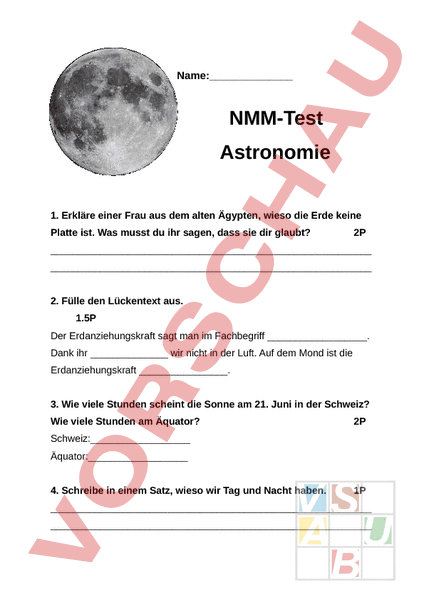 Name: NMM-Test Astronomie 1. Erkläre einer Frau aus dem alten Ägypten, wieso die Erde keine Platte ist. Was musst du ihr sagen, dass sie dir glaubt? 2P 2. Fülle den Lückentext aus. 1.5P Der Erdanziehungskraft sagt man im Fachbegriff . Dank ihr wir nicht in der Luft. Auf dem Mond ist die Erdanziehungskraft . 3. Wie viele Stunden scheint die Sonne am 21. Juni in der Schweiz? Wie viele Stunden am Äquator? 2P Schweiz: Äquator: 4. Schreibe in einem Satz, wieso wir Tag und Nacht haben. 1P 5. Zeichne im unteren Beispiel die verschiedenen Mondphasen ein, wie du sie auf der Erde erkennen kannst. Die beleuchtete Seite wird mit gelb angemalt, die unbeleuchtete mit schwarz. 4P 6. Um welche Mondphase handelt es sich auf dem Bild? 2P 7. Kannst du mir den Trick erklären, wie du erkennen kannst, ob der Mond zunehmend oder abnehmend ist? 1P 8. Fülle den Lückentext korrekt aus. 1.5P Der ist der einzige Stern, den wir das ganze Jahr am Sternenhimmel erkennen können. Früher half er den Seefahrern um sich in der Nacht zu. Er ist der Stern am Nachthimmel. 9. Was ist eine Sternschnuppe und was passiert, wenn sie sich der Erde nähert? 2P 10. Was ist ein Fixstern? Unterstreiche die richtige Antwort. 1P Ein Fixstern ist immer an der gleichen Stelle am Himmel zu sehen. Fixsterne sind Sonnen, die eigenes Licht erzeugen. Fixsterne sind diejenigen, die jede Nacht am Himmel erkennbar sind. Max. Punkte: 18 P. Erreichte P. Durchschnitt: Note: