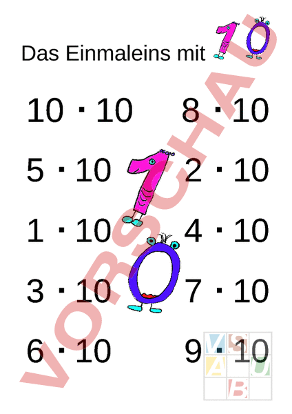 Das Einmaleins mit 10 10 8 10 5 10 2 10 1 10 4 10 3 10 7 10 6 10 9 10 Das Einmaleins-Klammerspiel Das Einmaleins-Klammerspiel dient als Übungsmaterial der Einmaleinssätze. Vorgehensweise: 1. Rückseite des Blattes mit den Ergebnissen des Einmaleinssatzes beschriften 2. Blatt laminieren 3. Holzwäscheklammern mit den Ergebnissen des jeweiligen Einmaleinssatzes beschriften Übungsweise: Die Kinder lösen die Übungsaufgaben und stecken die Wäscheklammern mit den passenden Lösungen an die Seite des Blattes. Selbstkontrolle: Die Ergebnisse werden auf der Rückseite verglichen.