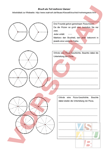 Bruch als Teil mehrerer Ganzer Arbeitsblatt zur Webseite: Drei Freunde gehen gemeinsam Pizza-Essen. Da die Pizzen so groß sind, bestellen Sie nur zwei. Jeder erhält: ------ Markiere den Bruchteil, den jeder bekommt in jeweils einer anderen Farbe. Erfinde eine Pizza-Geschichte. Beachte dabei die Unterteilung der Pizza. Erfinde eine Pizza-Geschichte. Beachte dabei wieder die Unterteilung der Pizza.