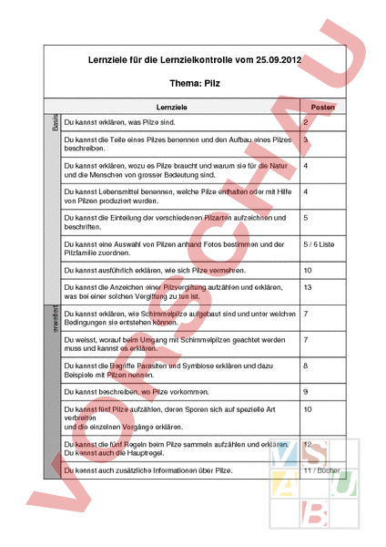 Arbeitsblatt: Lernziele Sachthema "Pilze"