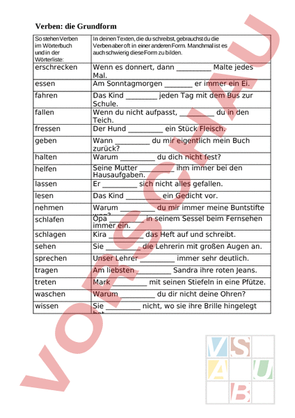 Verben: die Grundform So stehen Verben im Wörterbuch und in der Wörterliste: In deinen Texten, die du schreibst, gebrauchst du die Verben aber oft in einer anderen Form. Manchmal ist es auch schwierig diese Form zu bilden. erschrecken Wenn es donnert, dann Malte jedes Mal. Am Sonntagmorgen er immer ein Ei. essen fahren fallen fressen geben halten Das Kind jeden Tag mit dem Bus zur Schule. Wenn du nicht aufpasst, du in den Teich. Der Hund ein Stück Fleisch. Wann du mir eigentlich mein Buch zurück? Warum du dich nicht fest? lassen Seine Mutter ihm immer bei den Hausaufgaben. Er sich nicht alles gefallen. lesen Das Kind ein Gedicht vor. nehmen schlagen Warum du mir immer meine Buntstifte weg? Opa in seinem Sessel beim Fernsehen immer ein. Kira das Heft auf und schreibt. sehen Sie die Lehrerin mit großen Augen an. sprechen Unser Lehrer immer sehr deutlich. tragen Am liebsten Sandra ihre roten Jeans. treten Mark mit seinen Stiefeln in eine Pfütze. waschen Warum du dir nicht deine Ohren? wissen Sie nicht, wo sie ihre Brille hingelegt hat. helfen schlafen So stehen Verben In deinen Texten, die du schreibst, gebrauchst du die im Wörterbuch Verben aber oft in einer anderen Form. Manchmal ist es und in der auch schwierig diese Form zu bilden. Wörterliste: erschrecken essen fahren fallen fressen geben halten Wenn es donnert, dann Malte jedes Mal. Am Sonntagmorgen er immer ein Ei. Das Kind jeden Tag mit dem Bus zur Schule. Wenn du nicht aufpasst, du in den Teich. Der Hund ein Stück Fleisch. Wann du mir eigentlich mein Buch zurück? Warum du dich nicht fest? lassen Seine Mutter ihm immer bei den Hausaufgaben. Er sich nicht alles gefallen. lesen Das Kind ein Gedicht vor. nehmen schlagen Warum du mir immer meine Buntstifte weg? Opa in seinem Sessel beim Fernsehen immer ein. Kira das Heft auf und schreibt. sehen Sie die Lehrerin mit großen Augen an. sprechen Unser Lehrer immer sehr deutlich. tragen Am liebsten Sandra ihre roten Jeans. treten Mark mit seinen Stiefeln in eine Pfütze. waschen Warum du dir nicht deine Ohren? wissen Sie nicht, wo sie ihre Brille hingelegt hat. helfen schlafen