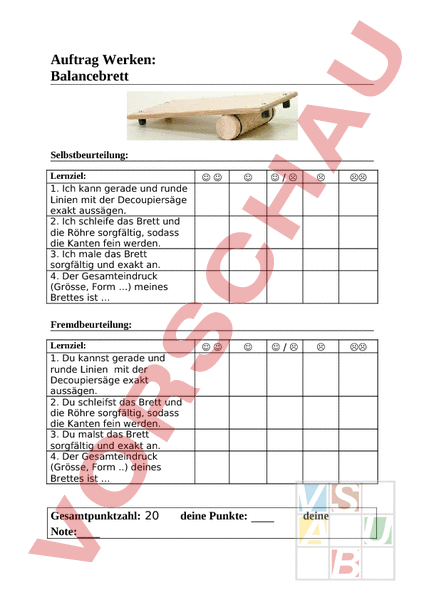 Auftrag Werken: Balancebrett Selbstbeurteilung: Lernziel: 1. Ich kann gerade und runde Linien mit der Decoupiersäge exakt aussägen. 2. Ich schleife das Brett und die Röhre sorgfältig, sodass die Kanten fein werden. 3. Ich male das Brett sorgfältig und exakt an. 4. Der Gesamteindruck (Grösse, Form ) meines Brettes ist / / Fremdbeurteilung: Lernziel: 1. Du kannst gerade und runde Linien mit der Decoupiersäge exakt aussägen. 2. Du schleifst das Brett und die Röhre sorgfältig, sodass die Kanten fein werden. 3. Du malst das Brett sorgfältig und exakt an. 4. Der Gesamteindruck (Grösse, Form ) deines Brettes ist Gesamtpunktzahl: 20 Note: deine Punkte: deine Unterschrift der Eltern: