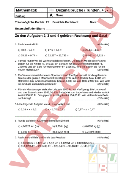 Mathematik MM2005 Prüfung Total mögliche Punkte: 25 Dezimalbrüche runden, , ) Name: Erreichte Punktzahl: Note: Unterschrift der Eltern: Zu den Aufgaben 2, 3 und 4 gehören Rechnung und Satz! 1. Rechne mündlich! (6 Punkte) a) 40,2 – 0,6 b) 17,5 7,5 c) 22,14 – 4,09 d) 35,26 9,74 e) 22,267 22,732 f) 48,922 – 15,921 2. Familie Huber will die Wohnung neu einrichten. Die neuen Möbel kosten: zwei Betten für die Kinder Fr. 345,55; ein Schrank für das Elternschlafzimmer Fr. 2450,95 und ein Sofa für Wohnzimmer Fr. 1456,80. Wie viel geben sie für die neuen Möbel aus? (2 Punkte) 3. Ein Verein veranstaltet einen Sponsorenlauf. Ein Sponsor will für die gelaufene Strecke der ganzen Mannschaft bezahlen. Fritz läuft 2,345 km; Max 1,987 km; Rolf 3,001 km; Andreas 2,678 km; Konrad 1,988 km und Reto 2,987 km. Wie viele km sind alle zusammen gelaufen? (2 Punkte) 4. Für ein Klassenlager steht der Lehrerin 2500 Fr. zur Verfügung. Die Unterkunft und das Essen kosten 1545,30. Die Bahnfahrt zum Lagerhaus und wieder zurück kostet 550,35 Fr. Der geplante Ausflug kostet 134,65 Fr. Wie viel bleibt am Ende noch übrig? (2 Punkte) 5 Löse folgende Aufgabe wie du es gewohnt bist! a) 2,39 x 6,2 b) – 1,70 0,91 (3 Punkte) c) 0,97 – 0,47 6. Runde auf die in Klammern stehende Einheit! (6 Punkte) a) 4,00827 km (m) b) 3,700 (kg) c) 0,0896 kg (g) d) 6,048 Fr. (Rp.) e) 2,9254 hl (l) f) 5,24 dm (mm) 7. Rechne schriftlich und runde das Resultat! a) 0,0638 km 5,125 km 5,12 km 1,02554 km 0,000025 km b) 514,1235 Fr. – 23,5498 Fr. – 123,54 Fr. – 98,165Fr. –1,111 Fr. (4 Punkte)