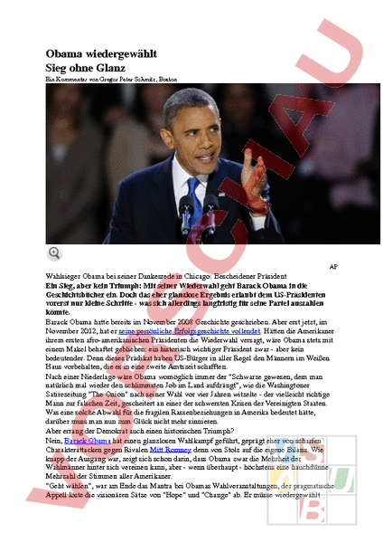 Obama wiedergewählt Sieg ohne Glanz Ein Kommentar von Gregor Peter Schmitz, Boston AP Wahlsieger Obama bei seiner Dankesrede in Chicago: Bescheidener Präsident Ein Sieg, aber kein Triumph: Mit seiner Wiederwahl geht Barack Obama in die Geschichtsbücher ein. Doch das eher glanzlose Ergebnis erlaubt dem US-Präsidenten vorerst nur kleine Schritte was sich allerdings langfristig für seine Partei auszahlen könnte. Barack Obama hatte bereits im November 2008 Geschichte geschrieben. Aber erst jetzt, im November 2012, hat er seine persönliche Erfolgsgeschichte vollendet. Hätten die Amerikaner ihrem ersten afro-amerikanischen Präsidenten die Wiederwahl versagt, wäre Obama stets mit einem Makel behaftet geblieben: ein historisch wichtiger Präsident zwar aber kein bedeutender. Denn dieses Prädikat haben US-Bürger in aller Regel den Männern im Weißen Haus vorbehalten, die es in eine zweite Amtszeit schafften. Nach einer Niederlage wäre Obama womöglich immer der Schwarze gewesen, dem man natürlich mal wieder den schlimmsten Job im Land aufdrängt, wie die Washingtoner Satirezeitung The Onion nach seiner Wahl vor vier Jahren witzelte der vielleicht richtige Mann zur falschen Zeit, gescheitert an einer der schwersten Krisen der Vereinigten Staaten. Was eine solche Abwahl für die fragilen Rassenbeziehungen in Amerika bedeutet hätte, darüber muss man nun zum Glück nicht mehr sinnieren. Aber errang der Demokrat auch einen historischen Triumph? Nein, Barack Obama hat einen glanzlosen Wahlkampf geführt, geprägt eher von scharfen Charakterattacken gegen Rivalen Mitt Romney denn von Stolz auf die eigene Bilanz. Wie knapp der Ausgang war, zeigt sich schon darin, dass Obama zwar die Mehrheit der Wahlmänner hinter sich vereinen kann, aber wenn überhaupt höchstens eine hauchdünne Mehrzahl der Stimmen aller Amerikaner. Geht wählen, war am Ende das Mantra bei Obamas Wahlveranstaltungen, der pragmatische Appell löste die visionären Sätze von Hope und Change ab. Er müsse wiedergewählt werden, weil er seine schwierige Aufgabe noch nicht vollendet habe, so lautete die eher schlichte Werbebotschaft des Präsidenten für seine zweite Amtszeit. US-Wahl 2012 Ergebnisse • Mitt Romney war ein ungeschickter, ungelenker Gegner War die absurd lange und absurd teure Wahlschlacht ein historisches Duell, so wie Obamas epochales Vorwahl-Ringen 2008 mit Parteirivalin Hillary Clinton? Auch das nicht, dafür erwies sich Republikaner Mitt Romney als ein Gegner, den die Geschichte zu rasch vergessen wird. Er ist ein ungeschickter, gar ein ungelenker Politiker. Historisch zu nennen ist eher die Dummheit der Republikaner, sich nicht entschlossener um die Minderheiten zu bemühen, die US-Wahlen zunehmend entscheiden. Dass AfroAmerikaner Obama die Stange halten würden, war zu erwarten. Aber hispanische Wähler wären für Lockrufe der Konservativen aufgrund der nach wie vor schwierigen USWirtschaftslage aufgeschlossen gewesen. Doch angesichts der plumpen Xenophobie der Republikaner, vom Kandidaten Romney zumindest im Vorwahlkampf fleißig gepflegt, entschieden sie sich mit überwältigender Mehrheit für den Amtsinhaber. Allein mit weißen Männern ist in den USA aber keine Wahl mehr zu gewinnen. Auch die Republikaner müssen einsehen, dass die immer schneller wachsende Gruppe amerikanischer Einwanderer nicht bloß im Land bleiben, sondern auch politisch mitbestimmen will. Das weiße Establishment stellt nur noch die Minderheit, musste selbst der stramm rechte FoxTV-Haudegen Bill OReilly anerkennen. Obamas Priorität: die Wirtschaft in Schwung bringen Ob Obama seine zweite Amtszeit beginnt, wie die erste endete mit einer Dauerblockade seiner Politik? Im US-Repräsentantenhaus stellen die Republikaner nach wie vor die Mehrheit. Und es ist keineswegs ausgemacht, dass die Grand Old Party ähnliche Schlüsse aus ihrer Niederlage ziehen wird wie nach dem Debakel ihres radikalen Kandidaten Barry Goldwater 1964 und in die Mitte rückt. Bereits am Wahlabend waren konservative Stimmen zu vernehmen, welche die Schuld an der Wahlniederlage auf den vermeintlich zu moderaten Kandidaten Romney schoben und seinen weit radikaleren Vize Paul Ryan als Zukunftshoffnung empfahlen. Unter diesen Vorzeichen wird der alte und neue Präsident Obama sich bescheiden müssen, und das ist gut so, für ihn und seine Partei. Anders als nach der Wahl 2008, die Demokraten als breites Mandat fehl interpretierten, muss Obama zumindest vorläufig das angehen, was Amerikaner am ehesten von ihm erwarten: die Wirtschaft in Schwung bringen und mehr Arbeitsplätze schaffen. Rund 60 Prozent der US-Bürger gaben dies in Umfragen als ihr wichtigsten Anliegen an. Der Demokrat wird also nicht mehr vorrangig kontroverse Projekte verfolgen können, die spaltend wirken wie seine historische Gesundheitsreform. Doch diese neue Bescheidenheit könnte sich für ihn und seine Partei auszahlen. Denn gelingt es Obama, über eine bald wieder wachsende US-Wirtschaft zu präsidieren was viele Ökonomen vorher sagen -, steigen die Chancen für jeden potentiellen demokratischen Nachfolger im Jahr 2016 rasant. Folgt auf Obama die erste Präsidentin? Darauf setzt etwa Ex-Rivalin Hillary Clinton, die bald als Außenministerin abtreten dürfte, um viel zu schlafen und eine mögliche Präsidentschaftskandidatur vorzubereiten, wie Vertraute berichten. Ihr Mann Bill hat auch deswegen so begeistert als Obamas Wahlkampfhelfer gewirkt, weil er auf diese Nachfolgeregelung hofft. Also könnte sich 2016 der Kreis der Geschichte schließen: mit der Staffelübergabe des ersten afro-amerikanischen Präsidenten der USA an die erste weibliche US-Präsidentin. Und so würden die Vereinigten Staaten von Amerika ein progressives Zeitalter einläuten. Barack Obama Als Barack Obama zehn Jahre alt war, erzählte er seinen Schulkameraden, sein Vater sei ein afrikanischer Prinz: Mein Großvater ist ein Häuptling, sozusagen der König des Stamms. Und wenn er, Little Barack, nur wollte, kö
