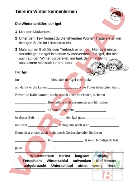 Tiere im Winter kennenlernen Die Winterschläfer: der Igel 1 Lies den Lückentext. 2 Unter dem Text findest du die fehlenden Wörter. Trage sie an der richtigen Stelle im Lückentext ein. 3 Male auf ein Blatt für dein Tierbuch einen Igel. Hier sind einige Vorschläge: ein Igel in seinem Winterversteck, ein Igel, der sich noch auf den Winter vorbereitet, ein Igel, der im Frühling aus seinem Versteck kommt, oder Der Igel Im frisst sich der Igel eine dicke an, damit er die kalten ohne Futter überstehen kann. Bevor die Kälte kommt, sucht er sich einen trockenen, sicheren Hier rollt er sich zusammen und hält seinen Er dauert ungefähr In dieser Zeit der Igel ganz und sein schlägt nur noch sehr Dann lässt er sich auch nicht durch Geräusche oder Berühren Im ganz ist sein Herbstspeck fast Wintermonate Herbst langsam Frühjahr Fettschicht Winterschlaf aufwecken fünf Monate aufgebraucht Unterschlupf atmet wenig Herz