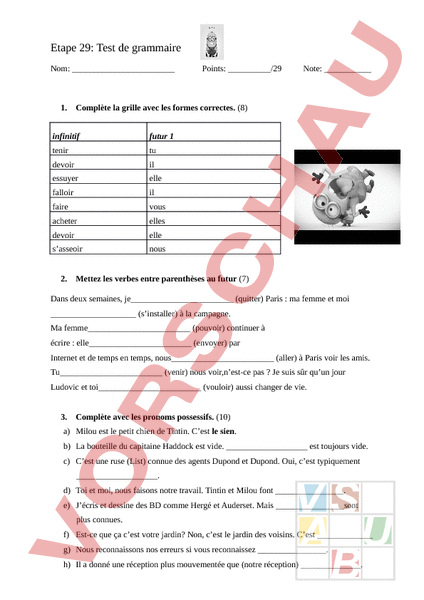 Etape 29: Test de grammaire Nom: 1. Note: Complète la grille avec les formes correctes. (8) infinitif futur 1 tenir tu devoir il essuyer elle falloir il faire vous acheter elles devoir elle sasseoir nous 2. Points: /29 Mettez les verbes entre parenthèses au futur (7) Dans deux semaines, je (quitter) Paris ma femme et moi (sinstaller) à la campagne. Ma femme (pouvoir) continuer à écrire elle (envoyer) par Internet et de temps en temps, nous (aller) à Paris voir les amis. Tu (venir) nous voir,nest-ce pas Je suis sûr quun jour Ludovic et toi (vouloir) aussi changer de vie. 3. Complète avec les pronoms possessifs. (10) a) Milou est le petit chien de Tintin. Cest le sien. b) La bouteille du capitaine Haddock est vide. est toujours vide. c) Cest une ruse (List) connue des agents Dupond et Dupond. Oui, cest typiquement. d) Toi et moi, nous faisons notre travail. Tintin et Milou font . e) Jécris et dessine des BD comme Hergé et Auderset. Mais sont plus connues. f) Est-ce que ça cest votre jardin? Non, cest le jardin des voisins. Cest g) Nous reconnaissons nos erreurs si vous reconnaissez . h) Il donné une réception plus mouvementée que (notre réception) . i) Serge jeté tous ses vieux journaux, mais moi, je nai pas jeté : j) Cest la voiture de Berta et Eve. – Cest . k) Moi, je fais des bonnes notes. Mais ne sont pas bien. Tu es nul! 4. Tu es un/une voyant(e). Ecris une phrase par image. Quest-ce qui se passera dans 5 secondes? (Schreibe einen ausführlichen Satz im Futur!) (4) 1. 2. 3. 4.