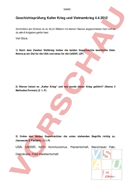 NAME: Geschichtsprüfung Kalter Krieg und Vietnamkrieg 4.4.2012 Kontrolliere am Schluss ob du ALLE Blättern mit deinem Namen angeschrieben hast und ob du alle 8 Aufgaben gelöst hast. Viel Glück. 1) Nach dem Zweiten Weltkrieg hatten die beiden Supermächte bestimmte Ziele. Nenne je ein Ziel für die USA und eines für die UdSSR. (2P) 2) Warum heisst es „Kalter Krieg und wie wurde dieser Krieg geführt? (Nenne 3 Methoden/Formen) (2 P) 3) Ordne den beiden Supermächten die unten stehenden Begriffe richtig zu. (Verwende 2 Farben). (1 P) USA, UdSSR, NATO Kommunismus, Planwirtschaft, Warschauer Pakt, Demokratie, Freie Marktwirtschaft Seite 1 NAME: 4) Nenne je drei Mitgliedstaaten der NATO und des Warschauer Paktes. (3P) 5) Nenne zwei Gründe für die Entkolonialisierung nach dem 2. Weltkrieg? (2P) 6) Zeitstrahl Bringe die Folgenden Ereignisse in die richtige Reihenfolge (Nummerierung) und erläutere ein Ereignis genauer (23 Sätze). (3 P) Offizieller Kriegseintritt USA Sozialsozialistische Republik Vietnam Gründung der Widerstandsbewegung „Vietminh Widerstandsbewegung Vietcong Vietnam als französische Kolonie Seite 2 NAME: 7) Positionen des Vietnamkrieges (5P) Du kennst vier verschiedene Positionen im Vietnamkrieg. Von welcher Position stammt wohl dieses Bild und welche Angst könnte es ausdrücken? (Begründe mit den einzelnen Bildelementen). Seite 3 NAME: 8) Auswahlaufgabe Brief an Regierung (6P) Wähle eine der folgenden Aufgabestellungen aus. 8a) Du bist die Mutter/ Vater eines vietnamesischen Agent Orange Opfers. Du schreibst einen Brief an die Regierung der USA, welcher sowohl deine Probleme schildert als auch deine Forderungen klarmacht. 8b) Du bist ein amerikanischer Kriegsveteran. Du schreibst einen Brief an die Regierung der USA, welcher sowohl deine Probleme schildert als auch deine Forderungen klarmacht. Seite 4