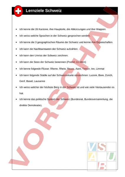 Lernziele Schweiz • Ich kenne die 26 Kantone, ihre Hauptorte, die Abkürzungen und ihre Wappen. • Ich weiss welche Sprachen in der Schweiz gesprochen werden. • Ich kenne die 3 geographischen Räume der Schweiz und kenne ihre Eigenschaften. • Ich kann die Nachbarstaaten der Schweiz aufzählen. • Ich kann den Umriss der Schweiz zeichnen. • Ich kann die Seen der Schweiz benennen (Posten 11 oben) • Ich kenne folgende Flüsse: Rhone, Rhein, Reuss, Aare, Tessin, Inn, Limmat • Ich kann folgende Städte auf der Schweizerkarte einzeichnen: Luzern, Bern, Zürich, Genf, Basel, Lausanne • Ich weiss welcher der höchste Berg in der Schweiz ist und wie viele Viertausender es hat. • Ich kenne das politische System der Schweiz (Bundesrat, Bundesversammlung, die direkte Demokratie).