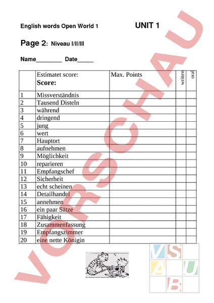 English words Open World 1 Page 2: UNIT 1 Niveau I/II/III Score: 1 2 3 4 5 6 7 8 9 10 11 12 13 14 15 16 17 18 19 20 Missverständnis Tausend Disteln während dringend jung wert Hauptort aufnehmen Möglichkeit reparieren Empfangschef Sicherheit echt scheinen Detailhandel annehmen ein paar Sätze Fähigkeit Zusammenfassung Empfangszimmer eine nette Königin Max. Points oral Estimatet score: written Name Date_