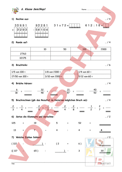 6. Klasse Sem1Rep1 Name: . 1) Rechne aus: 3 5‘ 6 9 1 3‘ 2 9 3 /4 9 3‘ 2 8 1 5 4‘ 1 0 4 31x72 612 18 2) Runde auf: /4 10 50 100 1‘000 2‘763 10‘175 3) Bruchteile: /6 1/5 von 100 1/8 von 1‘000 1/4 von 60 17/50 von 100 3/10 von 1‘000 5/12 von 60 4) Brüche kürzen: 6 18 /4 32 48 21 57 40 92 5) Bruchrechnen (gib das Resultat im kleinsten möglichen Bruch an): 2 3 1 4 2 5 1 2 2 4 2 8 /4 1 2 2 7 6) Setze die Klammern und berechne: /2 125 19 · 5 52 13 7 4 4 4 7) Welche Zahlen fehlen? 122 (( 117 tins /2 : 65 (2 6) 7 · 3 39 Seite 1 von 3 6. Klasse Sem1Rep1 Name: . 8) Notiere die fehlenden Zahlen: /2 8,0 9,0 4,7 4,8 9) Zähle in Einer-Schritten vorwärts und rückwärts /1 7,8 10) Zähle in Hundertstel-Schritten vorwärts und rückwärts /1 3,23 11) Springe vorwärts und rückwärts. Sprung 0,6 /1 7,4 12) Welche Zahl ist in der Mitte zwischen der Zahl und 1? 0 tins /1 1 Seite 2 von 3 6. Klasse Sem1Rep1 Name: . 13) Rechenbaum /4 Welche Zahl hat sich im Rechenbaum versteckt? 70 58 5 100 z Schreibe den Rechenbaum als Klammeraufgabe: Total Punkte: 36 tins Seite 3 von 3