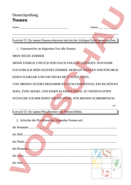 Deutschprüfung Nomen Name:_ Datum:_ Lernziel : Du kannst Nomen erkennen und mit der richtigen Farbe unterstreichen. 1. Unterstreiche im folgenden Text alle Nomen. MEIN NEUES ZIMMER MEINE FAMILIE UND ICH SIND NACH GOLDAU GEZOGEN. NUN HABE ICH ENDLICH MEIN EIGENES ZIMMER. MORGEN WOLLEN WIR FÜR MICH EINEN SCHRANK UND EIN NEUES BETT AUSSUCHEN. VON MEINEN ELTERN BEKOMME ICH ZUM GEBURTSTAG EIN RICHTIGES SOFA, ZWEI SESSEL UND EINEN KLEINEN TISCH. ZU WEIHNACHTEN WÜNSCHE ICH MIR EINEN NEUEN STUHL FÜR MEINEN SCHREIBTISCH. 14P Lernziel : Du kannst Pluralformen von Nomen bilden. 2. Schreibe die Pluralform der folgenden Nomen auf. die Freundin der Ball. der Punkt der Brunnen die Gans der Satz. 6P Lernziel :Du kannst Nomen durch Pronomen ersetzen. 3. Ersetzte die Nomen in der Klammer durch passende Pronomen. (Barbara). erwartet und schon am Treffpunkt. (Die Schüler). holen den Ball und die Schläger. (Das Museum).hat seine Tore geöffnet. (Der Ball) konnte nicht mehr gefunden werden. Anschliessend machen (Rainer und Reto) eine Verfolgungsjagd. 5P Lernziel : Du kannst Nomen von Adjektiven und Verben ableiten. 4. Bilde aus den Adjektiven und den Verben entsprechende Nomen. Schreibe auch den Begleiter auf. krank bekennen. ärgern eigen. bockig überlegen. 6P Lernziel : Du kennst den Begriff „Synonym und kannst Wörter zuordnen, die die gleiche Bedeutung haben. 5. Suche im folgenden Wortdurcheinander Synonyme. Verbinde die Paare mit einer Linie. Beginn Abschnitt Herkunft Abstand Vereinbarung Schulter Abscheu Abmachung Teilstück Erinnerung Absicht Abstummung Entfernung Angst Achsel Anfang Andenken Vorsatz Furcht Widerwille 10P maximale Punktzahl: 41 Ø erreichte Punktzahl: Elternunterschrift: Note: