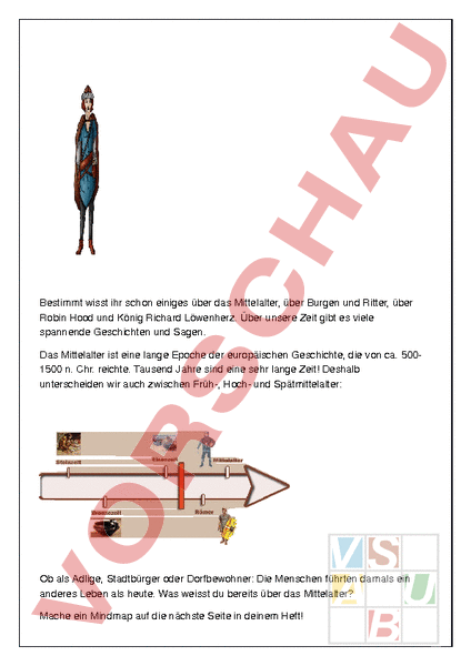 Bestimmt wisst ihr schon einiges über das Mittelalter, über Burgen und Ritter, über Robin Hood und König Richard Löwenherz. Über unsere Zeit gibt es viele spannende Geschichten und Sagen. Das Mittelalter ist eine lange Epoche der europäischen Geschichte, die von ca. 500 1500 n. Chr. reichte. Tausend Jahre sind eine sehr lange Zeit! Deshalb unterscheiden wir auch zwischen Früh, Hoch und Spätmittelalter: Ob als Adlige, Stadtbürger oder Dorfbewohner: Die Menschen führten damals ein anderes Leben als heute. Was weisst du bereits über das Mittelalter? Mache ein Mindmap auf die nächste Seite in deinem Heft!