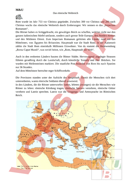 M&U Das römische Weltreich Rom wurde im Jahr 753 vor Christus gegründet. Zwischen 300 vor Christus und 200 nach Christus wuchs das römische Weltreich durch Eroberungen: Wir nennen es das „Imperium Romanum. Die Römer haben es fertiggebracht, ein gewaltiges Reich zu schaffen, welches nicht nur den ganzen italienischen Stiefel umfasste, sondern auch grosse Teile Europas, den Norden Afrikas und den Mittleren Orient. Zum Imperium Romanum gehörten alle Länder rund um das Mittelmeer, von Ägypten bis Britannien. Hauptstadt war die Stadt Rom. In der Kaiserzeit zählte die Stadt Rom eineinhalb Millionen Einwohner. Von da stammt die Redewendung „Roma Caput Mundi, was soviel heisst, wie „Rom, Hauptstadt der Welt. Auch in den eroberten Ländern bauten die Römer Städte. Hervorragend angelegte Strassen führten geradlinig durch die Landschaft, durch künstliche Tunnels und über Brücken. Sie wurden mit Meilensteinen markiert. Die staatliche Post brauchte von Rom bis nach Spanien nur 36 Stunden. Auf dem Mittelmeer herrschte reger Schiffsverkehr. Die Provinzen standen unter der Aufsicht der Hauptstadt. Damit die Menschen sich dort unterordneten, waren römische Soldaten überall anwesend. In den Ländern, die die Römer unterworfen hatten, lehrten (zwangen) sie die Menschen wie Römer zu leben: römische Kleidung tragen, römische Speisen verzehren, römische Götter verehren und Latein sprechen. Latein war die Umgangs- und Amtssprache im Römischen Reich.