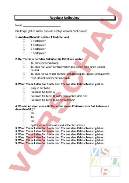 Regeltest Unihockey Name: Pro Frage gibt es immer nur eine richtige Antwort. Viel Glück!!! 1. Auf dem Kleinfeld spielen 1 Torhüter und 3 Feldspieler 4 Feldspieler 6 Feldspieler 8 Feldspieler 2. Der Torhüter darf den Ball über die Mittellinie werfen Ja, ohne Einschränkung. Ja, aber nur, wenn der Ball vorher den Boden oder einen Spieler berührt. Ja, aber nur wenn der Torhüter den Ball mit der linken Hand auswirft. Nein, das ist in keinem Fall erlaubt. 3. Wenn Team den Ball hinter dem Tor aus dem Feld schiesst, gibt es Bully in der Mitte Freistoss für Team Freistoss für Team in der Ecke neben dem Tor Freistoss für Team auf der Mittellinie 4. Wieviel Abstand muss die Mauer bei einem Freistoss vom Ball haben (auf dem Kleinfeld)? 5m 4m 2m egal, man kann den Abstand selber bestimmen 3. Wenn Team den Ball hinter dem Tor aus dem Feld schiesst, gibt es 3. Wenn Team den Ball hinter dem Tor aus dem Feld schiesst, gibt es 3. Wenn Team den Ball hinter dem Tor aus dem Feld schiesst, gibt es 3. Wenn Team den Ball hinter dem Tor aus dem Feld schiesst, gibt es 3. Wenn Team den Ball hinter dem Tor aus dem Feld schiesst, gibt es 3. Wenn Team den Ball hinter dem Tor aus dem Feld schiesst, gibt es