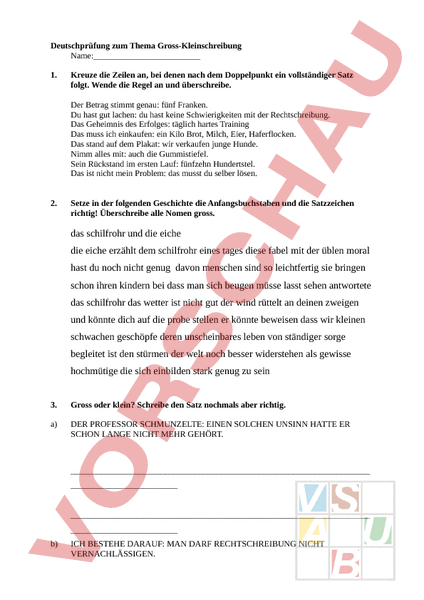 Deutschprüfung zum Thema Gross-Kleinschreibung Name:_ 1. Kreuze die Zeilen an, bei denen nach dem Doppelpunkt ein vollständiger Satz folgt. Wende die Regel an und überschreibe. Der Betrag stimmt genau: fünf Franken. Du hast gut lachen: du hast keine Schwierigkeiten mit der Rechtschreibung. Das Geheimnis des Erfolges: täglich hartes Training Das muss ich einkaufen: ein Kilo Brot, Milch, Eier, Haferflocken. Das stand auf dem Plakat: wir verkaufen junge Hunde. Nimm alles mit: auch die Gummistiefel. Sein Rückstand im ersten Lauf: fünfzehn Hundertstel. Das ist nicht mein Problem: das musst du selber lösen. 2. Setze in der folgenden Geschichte die Anfangsbuchstaben und die Satzzeichen richtig! Überschreibe alle Nomen gross. das schilfrohr und die eiche die eiche erzählt dem schilfrohr eines tages diese fabel mit der üblen moral hast du noch nicht genug davon menschen sind so leichtfertig sie bringen schon ihren kindern bei dass man sich beugen müsse lasst sehen antwortete das schilfrohr das wetter ist nicht gut der wind rüttelt an deinen zweigen und könnte dich auf die probe stellen er könnte beweisen dass wir kleinen schwachen geschöpfe deren unscheinbares leben von ständiger sorge begleitet ist den stürmen der welt noch besser widerstehen als gewisse hochmütige die sich einbilden stark genug zu sein 3. Gross oder klein? Schreibe den Satz nochmals aber richtig. a) DER PROFESSOR SCHMUNZELTE: EINEN SOLCHEN UNSINN HATTE ER SCHON LANGE NICHT MEHR GEHÖRT. b) ICH BESTEHE DARAUF: MAN DARF RECHTSCHREIBUNG NICHT VERNACHLÄSSIGEN. c) FÜRS BASTELN DES STERNS BRAUCHEN WIR: EINE SCHERE, EINEN LEIMSTIFT UND VIELE FARBEN d) FÜR DIESE ARBEIT SIND ZUSTÄNDIG: VRENI, FRANZ UND PETER 4. Gross oder klein? Schreibe den Satz nochmals aber richtig. 1. Sie hat RECHT. 2. Sie hat das RECHT auf ihrer Seite. 3. Er ist SCHULD. 4. Man konnte ihm keine SCHULD nachweisen. 5. Es ist SCHADE. 6. Das ist sein eigener SCHADEN. 7. Es tut uns LEID. 8. Er leidet grosse NOT. 9. Es ist den Eltern ERNST. 10. Sein GRAM bedrückt auch mich. 11. Wir sind PLEITE. 12. Diese Uhr hat einen grossen WERT. 13. Er hat UNRECHT, wenn er das behauptet 14. Die Firma geht PLEITE. 15. Wir hatten grosse ANGST. 5. Schuld oder schuld? 1. Das war meine chuld 2. Sie ist chuld daran 3. Der Fahrer hatte chuld auf sich geladen. 4. An allem war das Wetter chuld. 5. Sie sollen ihm seine chuld beweisen. 6. Wir haben noch chulden bei ihm. 7. Wem gebt ihr die chuld am Versagen? 8. Du hast dir etwas zu chulden kommen lassen. 9. Er trägt chuld an diesem Debakel. 10. Es ist nicht gut, chulden zu machen. 6. leid oder Leid? 1. Das wird dir noch eid tun. 2. Ihr ist grosses eid widerfahren. 3. Sein Verhalten tat ihm eid. 4. Das ewige Herumziehen ist ihm eid. 5. Des einen Freud ist des anderen eid. 6. Er tut keiner Fliege etwas zu eide. 7. Hat er sich ein eid angetan? 8. Wir halten zusammen, in Freud und eid. 7. An was erkennst du bei den folgenden Wörtern, dass es sich um Nomen handelt? Nomen Seilschaft, Gemeinschaft des Turmes, der Sonne mein Haus, ihr Hund Meinung, Achtung jener Mann, diese Frau Klarheit, Seltenheit das Mädchen, der Baum Menschen, Brunnen das blaue Heft, die kleine Merkmal, Begründung weiteres Beispiel Blume 8. Setze die Satzzeichen richtig und korrigiere die GrossKleinschreibung? a) hans sagt ich begrüsse euch b) wann fragt tiziano müssen wir gehen c) sie fragte wann kommst du wieder d) wann fragte sie kommst du wieder und nahm die agenda hervor Total mögliche Punkte: total gemachte Punkte: Note: