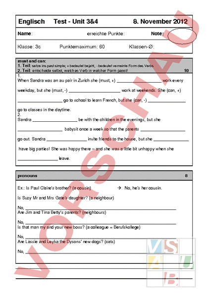 Englisch Test Unit 3&4 Name: Klasse: 3c 8. November 2012 erreichte Punkte: Punktemaximum: 60 Note: Klassen-: must and can: 1. Teil: setze ins past simple; bedeutet bejaht, bedeutet verneinte Form des Verbs 2. Teil: entscheide selbst, welches Verb in welcher Form passt! 10 1. When Sandra was an au pair in Zurich she (must, ) work every weekday, but she (must, -) work at weekends. She (can, ) go to school to learn French, but she (can, -) go to classes in the daytime. 2. Sandra be with the children in the evenings, but she babysit once week so that the parents go out. Sandra invite friends to the house, but she have big parties! She was happy there – and she was little bit unhappy when she leave. pronouns Ex.: Is Paul Claires brother? (a cousin) 8 No, hes her cousin. Is Suzy Mr and Mrs Gates daughter? (a neighbour) No, Are Jim and Tina Bettys parents? (neighbours) No, Is that man my and your new boss? (a colleague Berufskollege) No, Are Lassie and Leyka the Dysons new dogs? (cats) No, Pronounsagain 10 Its my book. It belongs to_. Its Its car. It belongs to us. Its Its pencil. It belongs to her. Its Its their orange. It belongs to. Its Its hat. It belongs to . Its his. Find the mistakes (suche die Fehler, sofern es welche hat!) and correct them! 5 How many children have they got? Not very much. How many beer does he drink? Just little. How many English books has she got? Only few. How much plants has she got at home? lot. How much money has he got? Only few. How many How much (Thema: food and drinks at party!) 4 are there? There are 12 on tray. is there? There are two bottles. How muchdid you drink? ! Translate – Übersetze! Ich freue mich, im Garten zu arbeiten! Ihr freut euch nicht, wieder zur Schule zu gehen. Sie freuen sich, ihre Kinder zu sehen. 10 Er freut sich nicht, wieder anfangen zu arbeiten. Wir freuen uns aufs Wochenende. Irregular and regular verbs – past forms and past participles verb past simple was/were swim read heard drank past participle see meet 8 started Answer these questions with short answer! Has your best friend ever been to the USA? – Yes, . How much money does an au pair earn? Do au pairs often have to work on weekends? . Have you ever Fondue? Have your grand parents ever been to New Zealand? 5